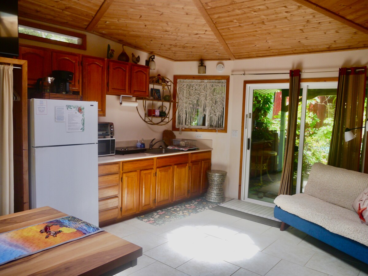 Escape to this private Hawaiian paradise, tucked away in a family friendly neighborhood minutes from Hanalei. Walking paths to shops, beaches, outdoor markets, cafes and grocery store are out the front door. Mornings on the lanai promise bird songs and tranquility as you sip your coffee or maybe you'll catch a few waves at Hanalei Bay before breakfast. Evenings dazzle here as you unwind and relax under twinkling cafe lights. You'll come for the beach but you'll stay for the rainbows.