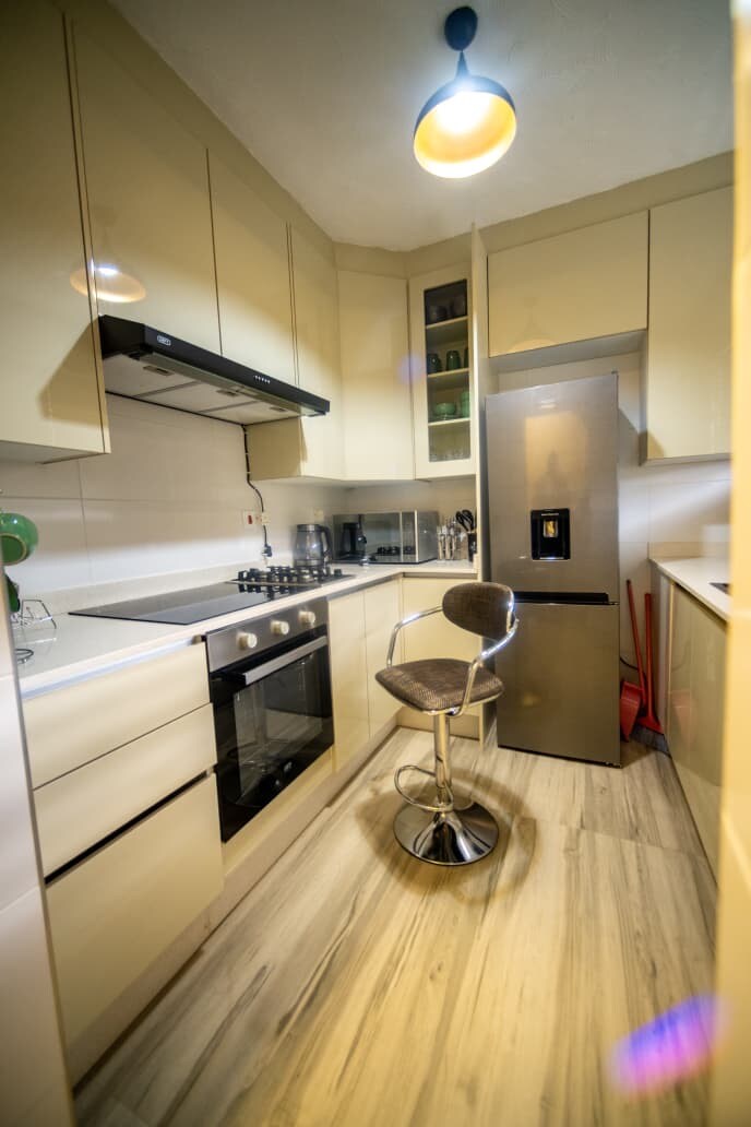 This special place is close to everything, making it easy to plan your visit. This magnificent ground floor apartment has 2 bedrooms and built in cupboards. Has lounge cum dining room and a separate fitted and exotic kitchen. The apartment has 10 000l back up water tank, a 3kva inverter /solar power back up, a 55 inch smart TV featuring You tube, Netflix etc. Has hot shower with good pressure , fast uncapped wifi. Very central and close to many essential services eg supermarkets, hospitals.