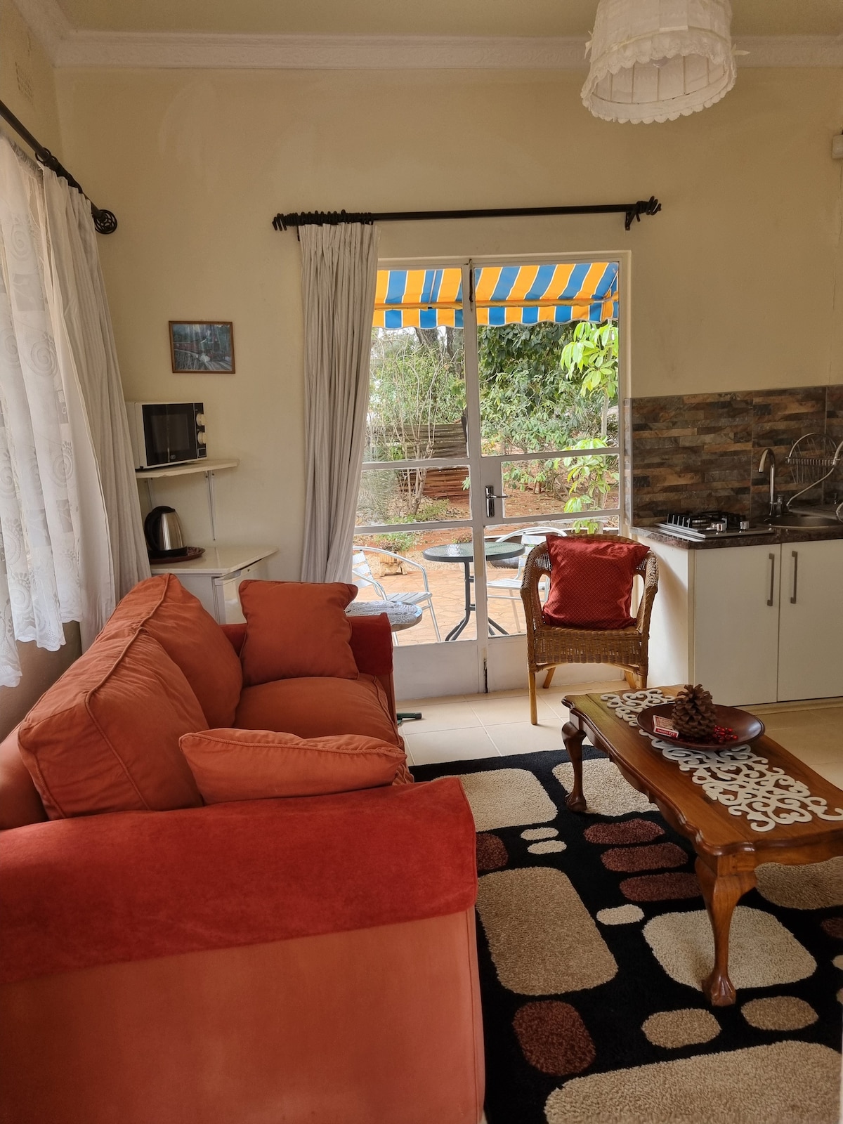 Indulge in sophisticated tranquillity in this beautiful one-bedroom flatlet. Rustle up something to eat in the cosy kitchenette with a stove & microwave. Or unwind in the comfortable lounge with a 55" smart TV, Netflix & DStv, and surf to your heart's content on the fast, unlimited WiFi, sipping something cold from the fridge. Or you can step outside and immerse yourself in the serene garden surroundings. Enjoy a peaceful stay in this quiet & classy home-away-from-home with full solar backup.