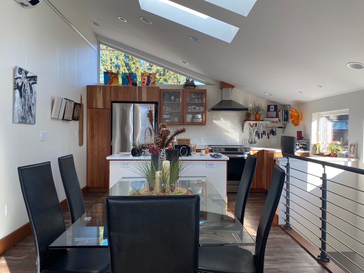 CLEAN & MODERN! SWEEPING VIEWS! **TAKE NOTE: Two flights of stairs. BEAUTIFUL DECOR, 2 bedrm/2 bth unit. TOP FLOOR: Airy & open living rm/kitchen/dining rm, affords tree canopy views & privacy. Easy stroll to highly rated restaurants, cafes, parks, grocery, library & light rail. - Convenient, Safe & Quiet N. Beacon Hill neighborhood. - EZ access to all tourist & cultural attractions, sports & music venues. - BH Light rail station to downtown, airport, Jefferson Pk, all w/in 12 min walk.