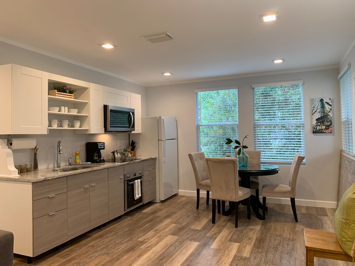 Newly Remodeled stylish and private studio suite with queen bed, bathroom, living/dining/work area, kitchenette (Dry), and shared laundry in the trendy Old Seminole Heights neighborhood. With an 83/100 walk score its easy to visit bars, restaurants, diners, bakeries, and quaint shops, or stroll the tree-lined streets of 100+ year old houses. This spot is perfect for the Tampa explorer with easy access to downtown. Free street parking, free WiFi, free shared laundry (in adjacent space).