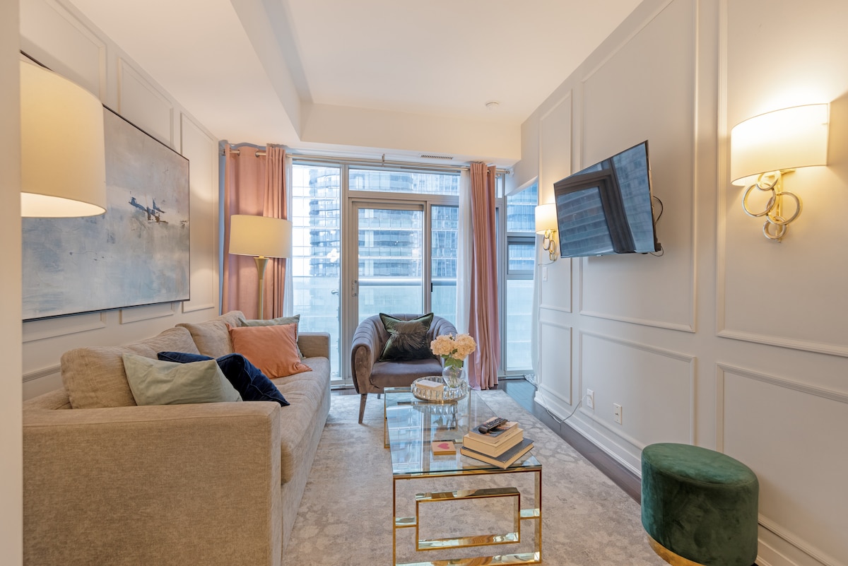 A newly-furnished condo located at the heart of Downtown Toronto guaranteed to maximize your stay with everything at close proximity. This condo has 10 ft ceilings and over 700 sq ft We provide High-speed WiFi, Cable TV, washing machine/dryer, and basic amenities. Explore Toronto right at your doorstep: - Metro Toronto Convention Centre 30m - CN tower/Rogers Centre 210m - Union Station 500m - Harbourfront Centre 700m - Air Canada Centre 900m - TIFF Bell Lightbox