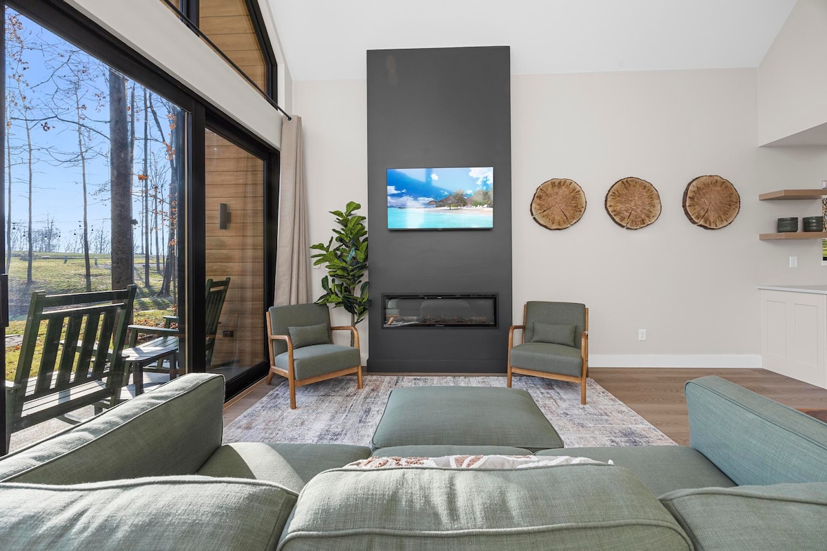 Newly Constructed Cabin on 40 Acres... Sleeps 12 (6 Adults, 6 children)...Peaceful Country Setting with many amenities which include 7 person hot tub with amazing views, Lots of deer and wildlife, fully stocked country kitchen w/ apron sink and large kitchen island, outdoor grill and griddle, game room, kids room with gaming, cornhole, fiber internet, plenty of outdoor seating, Fire pit, purple mattress on queen bed and king beds with purple sheets.