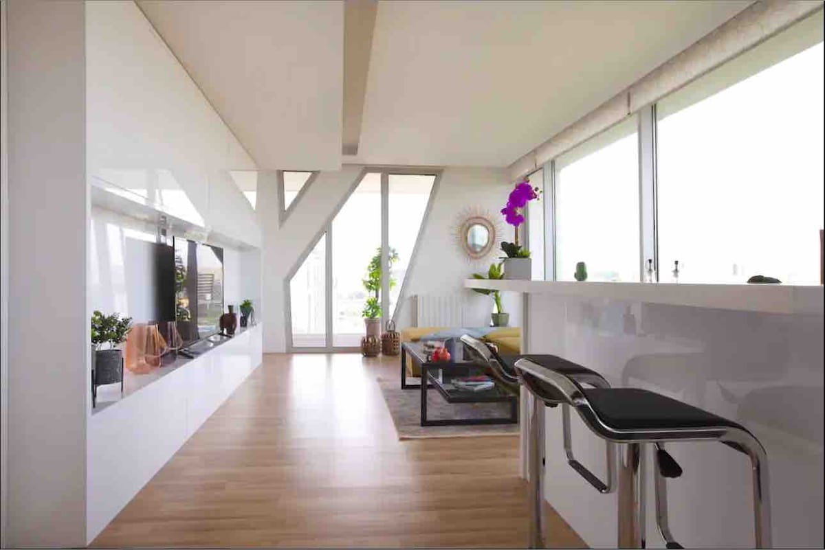 Exclusive luxury residence in Sin El Fil, featuring panoramic views, and floor-to-ceiling windows. Designed for guests seeking a premium experience with the privacy of a home. Located in the unique and iconic building of The Cube, just 3 minutes from Habtoor Grand Hotel Beirut. Set in a modern and secure building, this fully equipped apartment is perfect for couples, professionals, or longer stays.