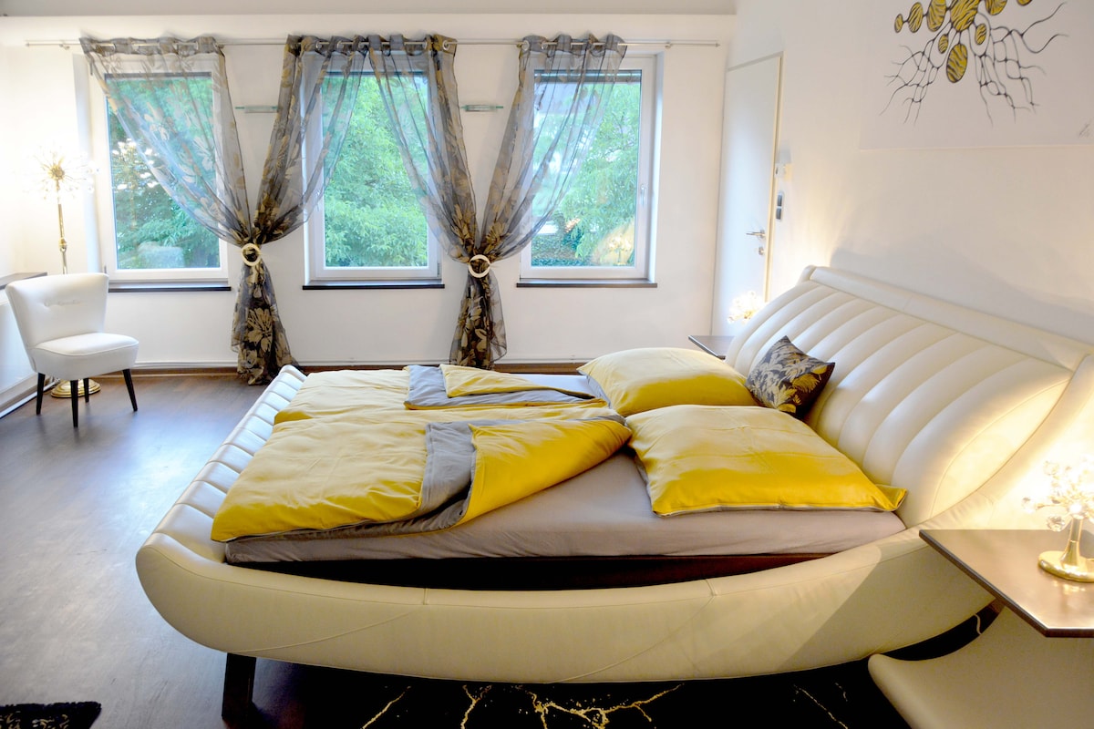 Our designer apartment is conveniently located with a large garden, barbecue area, several cozy retreats and a natural swimming pond on the outskirts of town. The apartment, furnished in an extravagant style, is located on the second floor. Kitchen with espresso machine, dishwasher, washing machine as well as terrace and view of the countryside, TV and Internet await you. Bathroom with rain shower and walk-in closet.