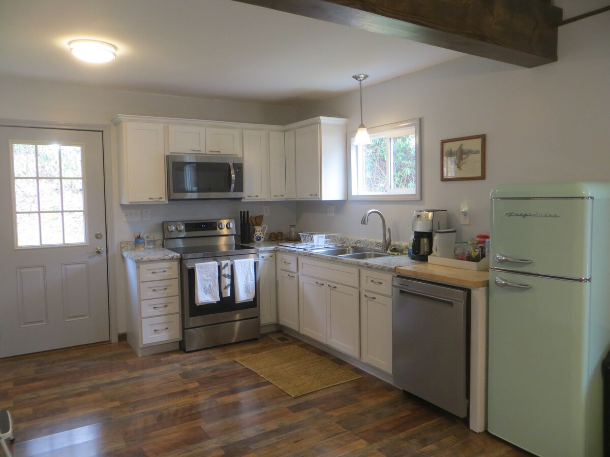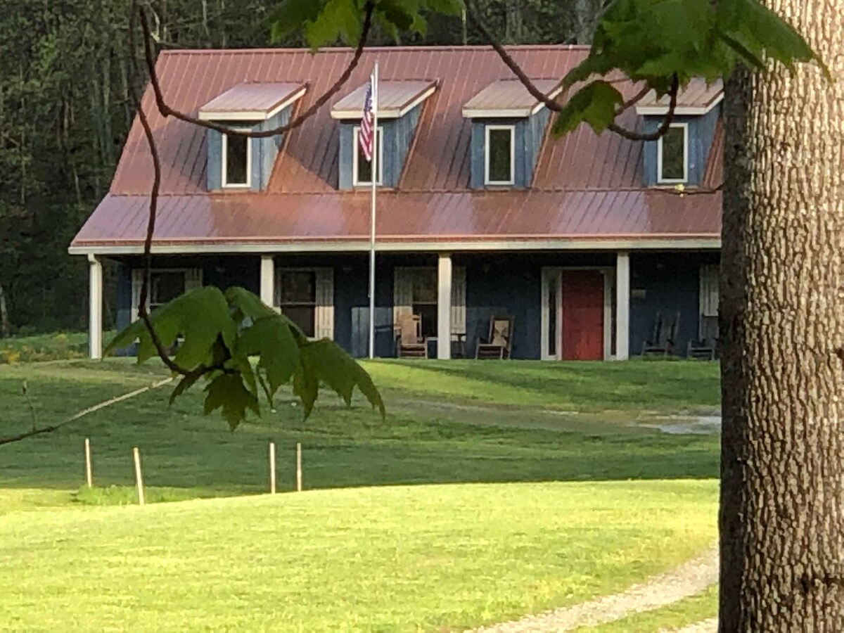 Awaken in a luxury king size bed and slide open the garage door to sweeping views of the Smokies. Enjoy coffee on the deck. Fully furnished bed and bath, AC/Heat and kitchenette. Pets permitted $40/first pet $20/each additional pet. Area is fenced. Listen to the river while lying in the in-deck hammock. The perfect stage for a restful afternoon or night time stargazing. Watch the wildlife and farm animals or fish for trout in our 1/2 mile of river. Quiet~ private~ breathtaking~ accessible~