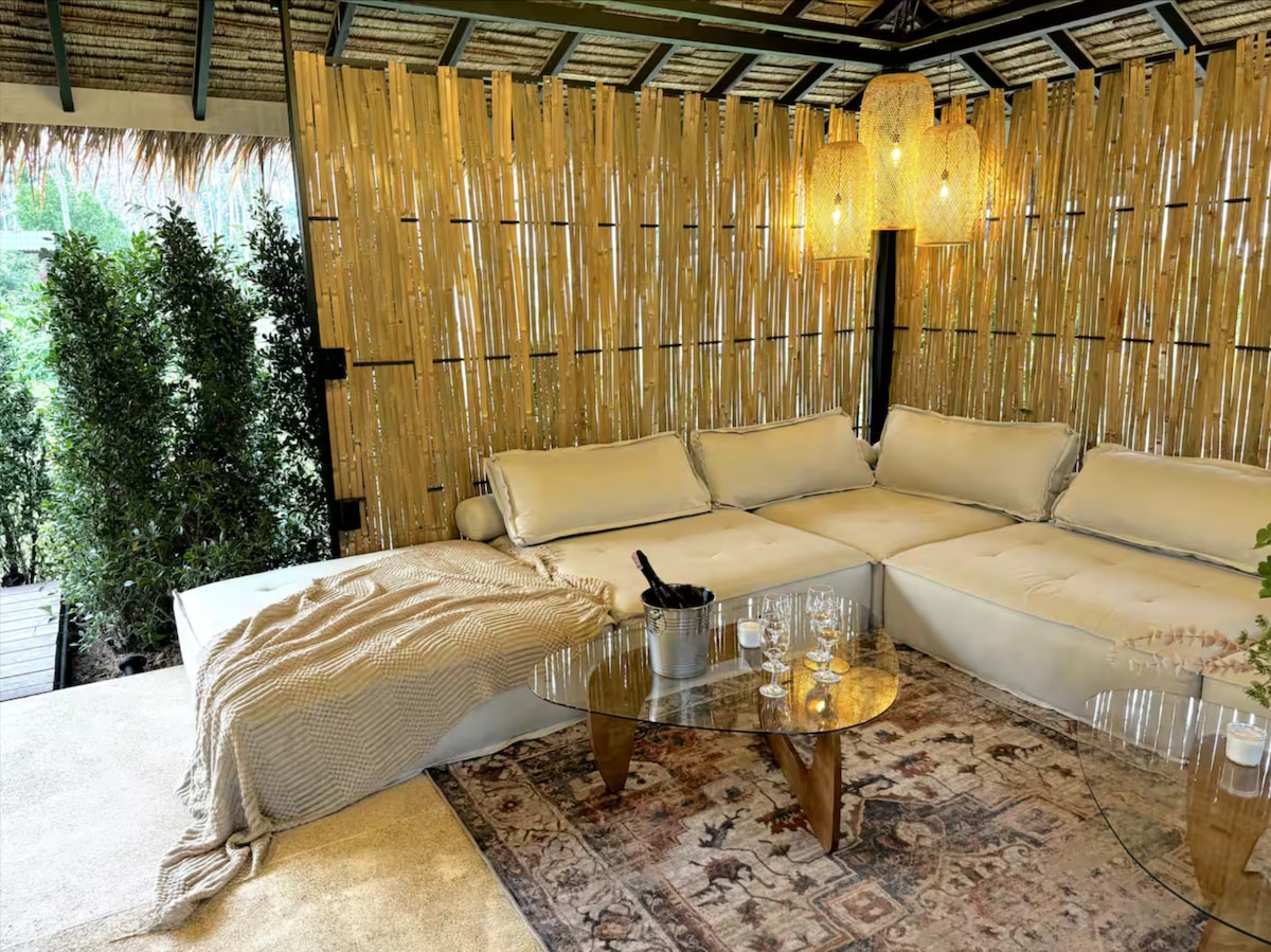 A private bungalow is set amidst lush greenery, featuring a small swimming pool in the foreground. The open-air design showcases a spacious living area and dining space under a thatched roof, framed by palm trees and a clear blue sky.