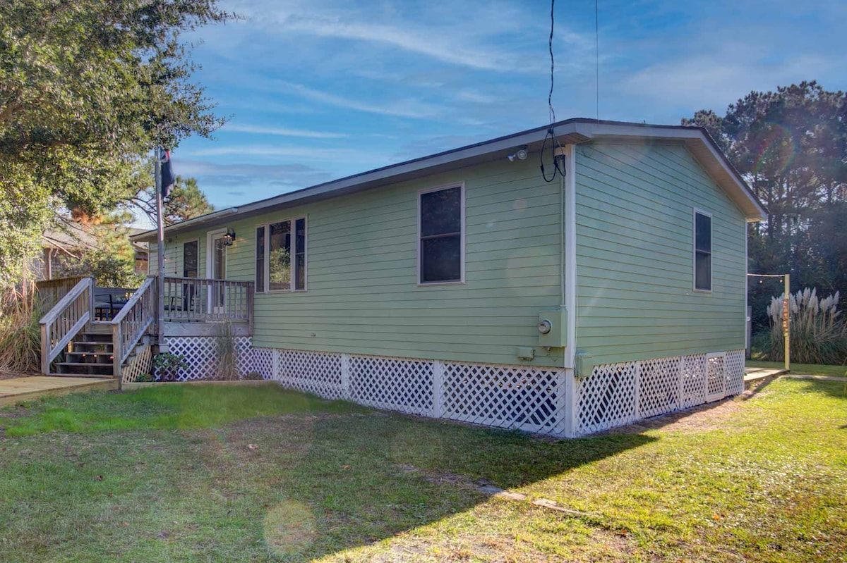 SeaGlass Cottage is a brand new, fully renovated house that sits peacefully in the beautiful woods of Frisco. Only a quick 5 minute drive to the beach and only right down the road to Ramp 49! The house offers 3 bedrooms (4 beds total), full kitchen(all new appliances), living room with large smart TV and pull out couch, 3 spacious decks for dinning and lounging, a grass yard, and outdoor shower. The house also features ample parking that can accommodate all guests, even with boats and trucks!
