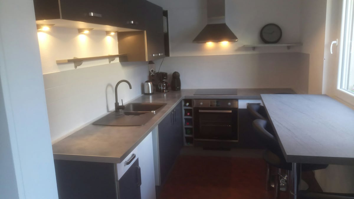 Nice and bright 46 m² apartment, on the ground floor of a house, with individual entrance door. It is composed of a living room with kitchen and TV, a large bedroom with reading corner and desk as well as a bathroom with toilet, shower/bath. Parking space is available in the courtyard for parking. The accommodation is located in a quiet area, a 2-minute walk from the train station, a supermarket and 5 minutes from the pretty city center of Thann.