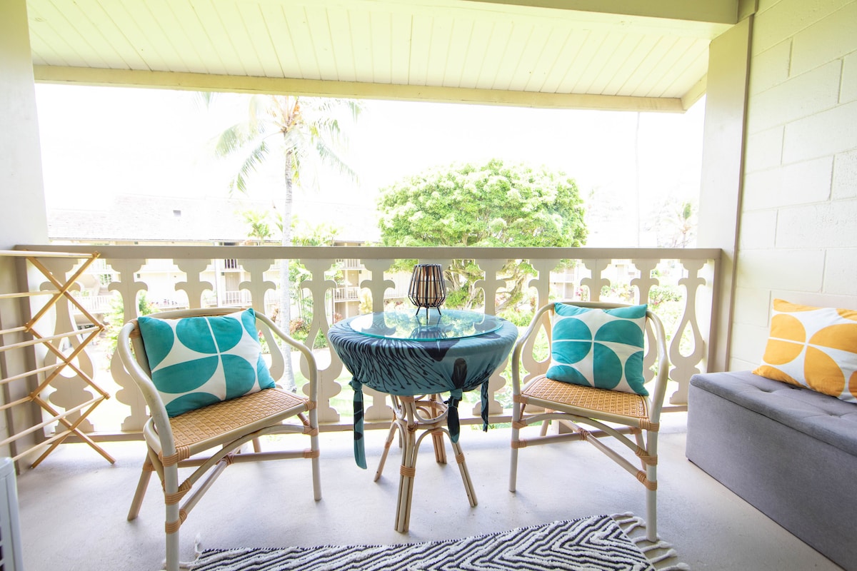 This bright and airy updated condo is the ideal place to stay in sunny Poʻipū for couples, honeymooners + small families. The open living space is clean and welcoming with a coastal boho vibe, and you'll enjoy beautiful ocean + garden views from the huge upper-level lanai. Location is the absolute best - from the beachfront property, you can walk to several of the best beaches on the south shore, local coffee, restaurants, shops, and the incredible pool within minutes.