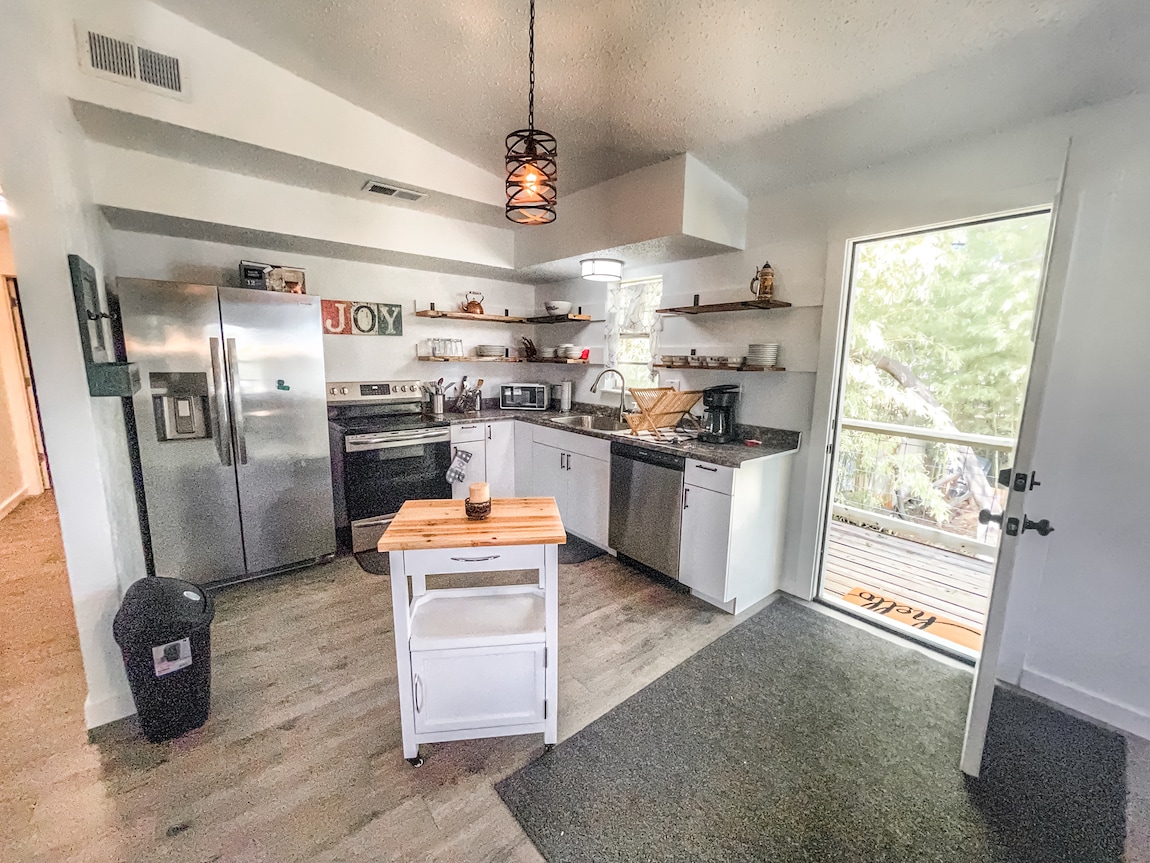 Enjoy the rustic atmosphere of this charming vacation rental in Canyon Lake, Texas, for your next spontaneous getaway! The 1-bath studio cottage features a sheltered front porch with seating, ideal for enjoying the weather with a cup of coffee. Let your pets roam free in the spacious fenced yard, followed by an evening picnic in Overlook Park as the sun sinks over the lake. Complete with all the comforts of home, this charming abode offers easy access to endless adventure and activities!