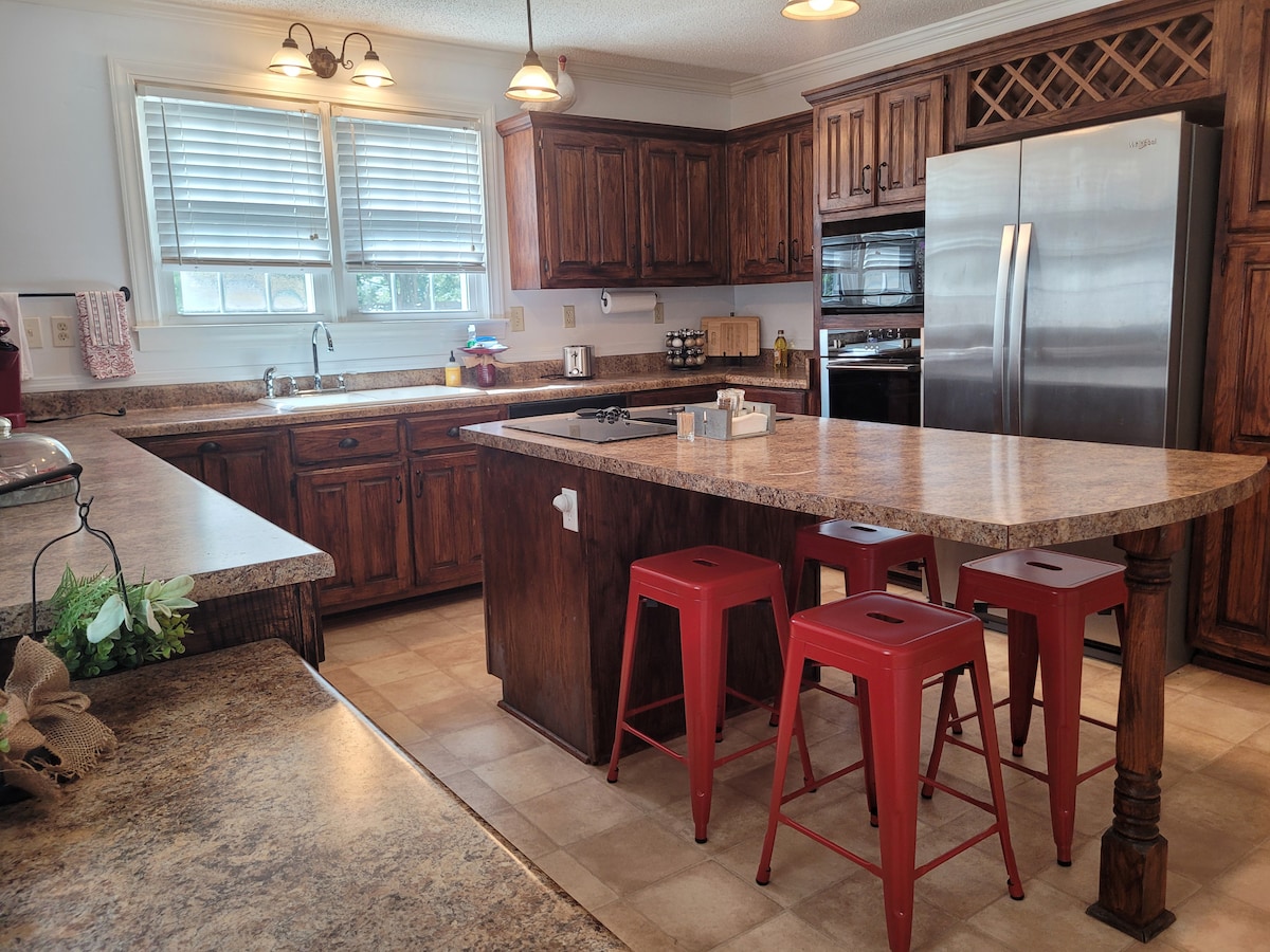 Nestled just 4 miles from I-40, this centrally-located entire home is available for your family, guests and pets. Features California king in the primary and a queen in the second bedroom, 4 twin beds in 2 upstairs bedrooms. Also includes a futon in the office, 2 newly remodeled bathrooms, dining room, fully equipped eat-in kitchen with washer/dryer, large family room with bar, Smart-TV, piano and fireplace. All bedrooms and office have a Smart-TV.