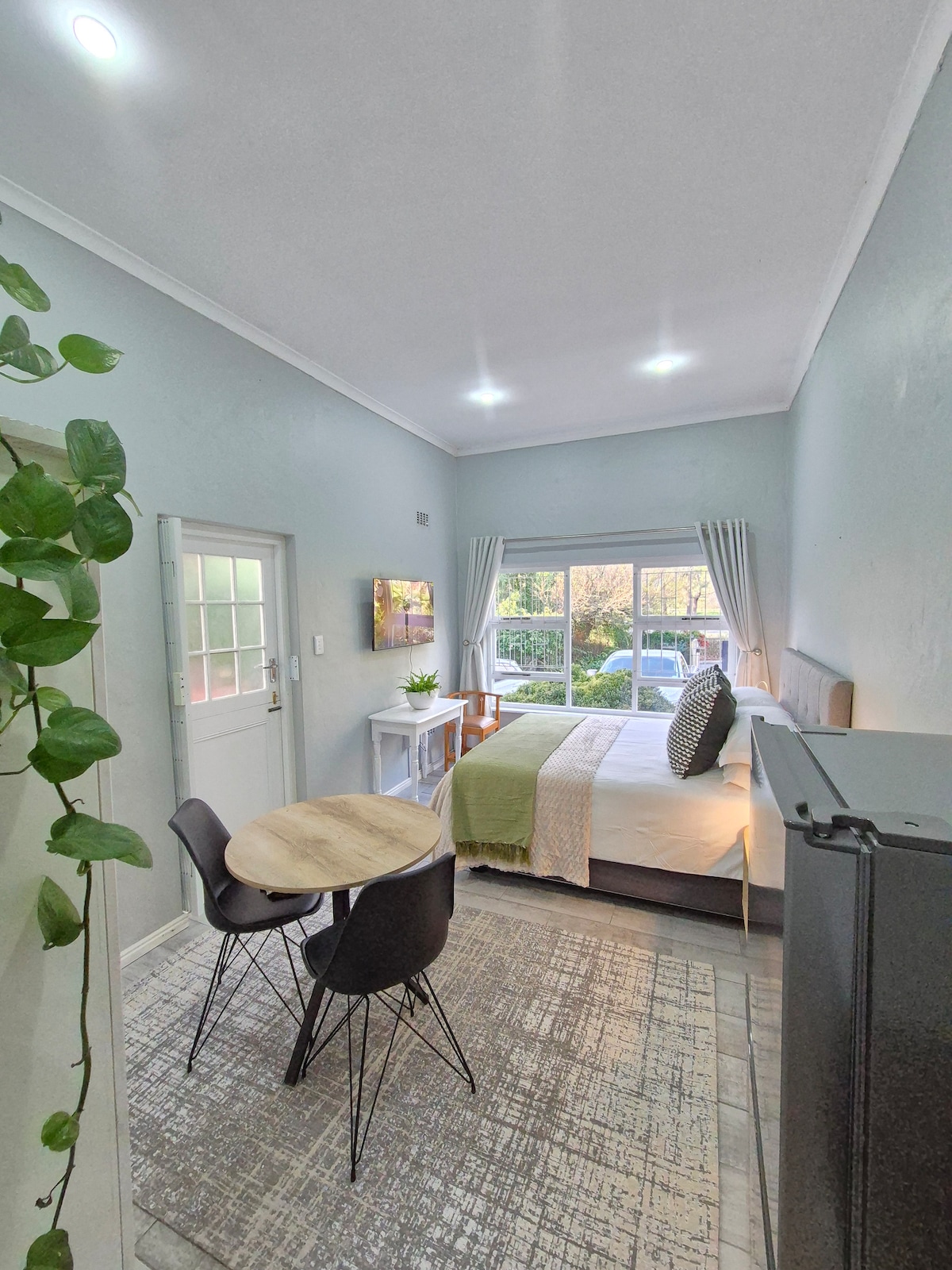 A tranquil indoor-outdoor living space ideal for couples or business travelers. The stylish studio opens up onto a large patio with braai. Enjoy our long summers outdoors! The studio has a separate entrance from the main house. Queen bed with open walk-in shower & separate toilette . It has fiber WI-FI, full DSTV, a tiny kitchenette with tea/coffee facilities, toaster, microwave, fridge & single induction plate. Secure onsite parking. We have 2 Small dogs for added security.
