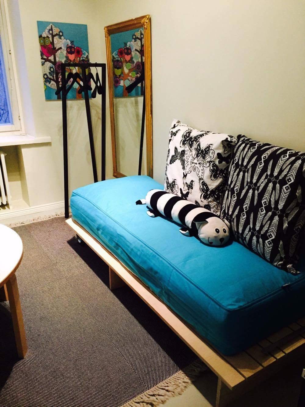 Peaceful 36 m2 apartment in the very city in Helsinki with a sauna. The apartment is located in the so called Design District in Helsinki, 5 min walk away from the city centre, with many cute boutiques and stores nearby. Tram and bus stops with great connections almost across the street! It is a spacious one room apartment with fully equipped kitchen, a sauna and room for four persons. Suitable for a family, a couple or a small group of friends.