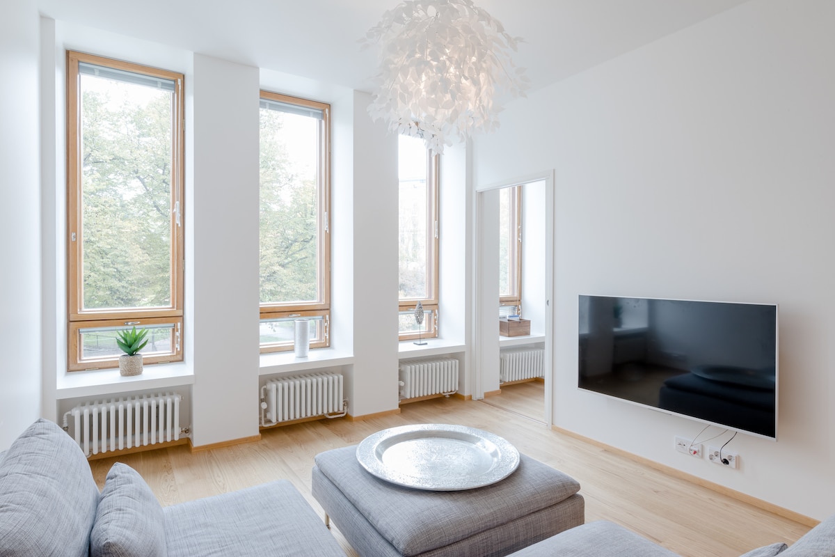 If you love nice surroundings at the city center, my place is just right for you. This has especially been designed for diplomats or anyone who is about to come to Helsinki for a longer period (there is availability also shorter stays as well when we are traveling). Your home would be right next to Uspenski Cathedral and all the main attractions of the city. Here are the Bridge of Love Locks, the Helsinki Sky Wheel, the Helsinki Fly Tour multi experience movie theater (flying experience over Helsinki), Allas Sea Pool Helsinki, the Market Square, The Presidential Palace, City Hall, The Old Market Hall, Helsinki Cathedral, the Helsinki City Museum and ferries to the fortress Suomenlinna (and Tallin, Estonia). Right beside these are the main shopping area and department stores of the city. This apartment is a brand new (2019) renovation/conversion at old commercial building from 1940's. Designed by architect Toivo Paatela. The apartment has nice views to park named after creator of Moomin characters, Tove Jansson. The kitchen is fully equipped with a microwave oven, stove/oven, toaster, dishwasher, and coffee makers. There is a hair dryer, washing machine, clothes dryer, iron, and a vacuum cleaner. Katajanokka ferry terminal (ferries to Tallin) is just a 600-meter walk (or two minutes with tram #5) from my apartment. PLEASE NOTICE! Bedrooms are tiny (8m2), and the second bedroom offers no natural light, and it is very quiet, which makes it great for daytime naps. BEDS: Standard set up is one queen bed in both bedrooms. We can divide those into single beds, if needed