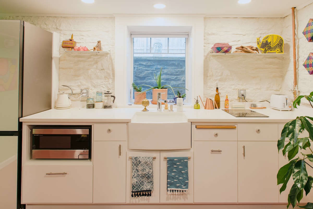 The Studio is located at the garden level of our house. It's furnished with queen size bed,Gorgeous Indonesian day-bed. A full modern kitchenette and a stunningTurkish style bath-room with a walk-in shower-room. It also has its own privet entrance from the back of the house and a privet laundry room. The minute you step-in you'll immediately feel transformed. Its decorated with some beautiful ethantic hand embroidered Indian and Egyptian textile, Art-work from Havana and rugs from Iran.