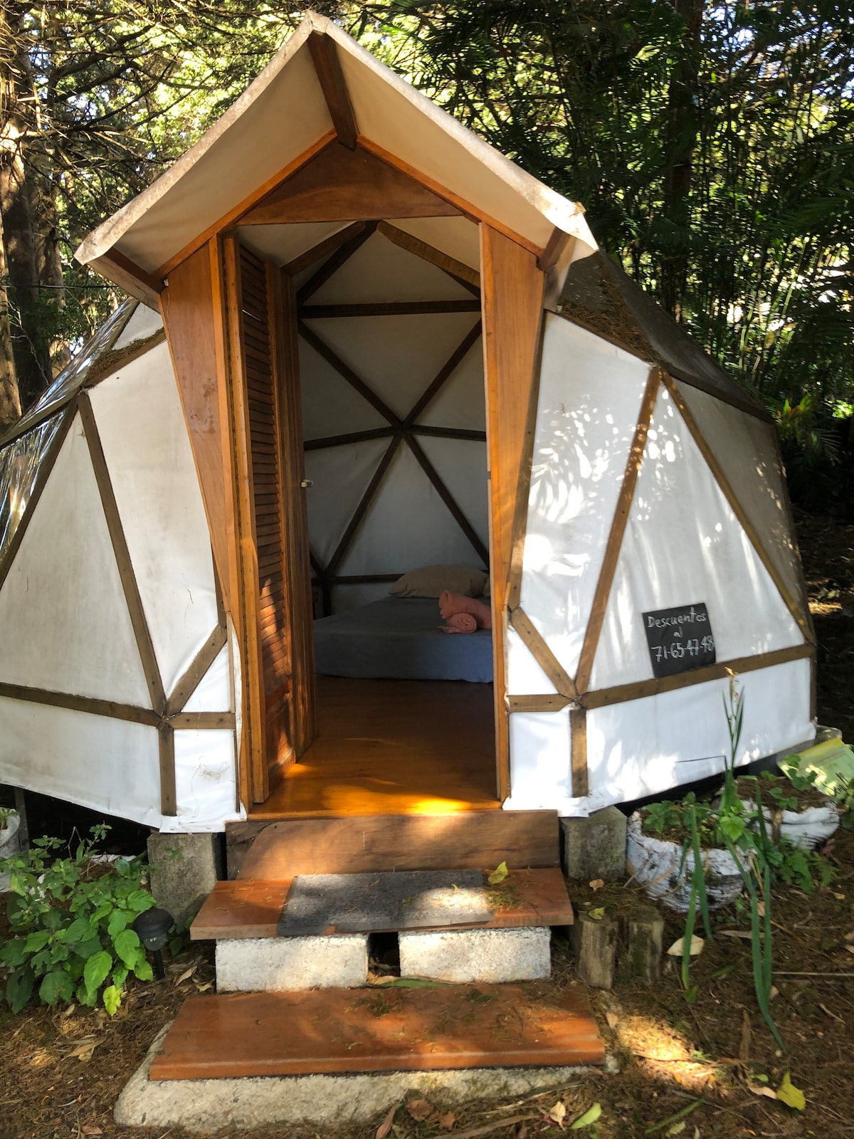 Enjoy a glamping experience at Quinta Conexión-Amaru in this beautifully crafted geodesic Dome, with a shared bathroom and shower, just steps away.Sleep soundly in the forests embrace. This part forest and part landscaped property, invites you to have an expansive experience, fully embraced in nature. Please note that there may be other guests staying at the property as well. We offer a delicious & healthy breakfast made with the highest quality ingredients, and organic when possible.