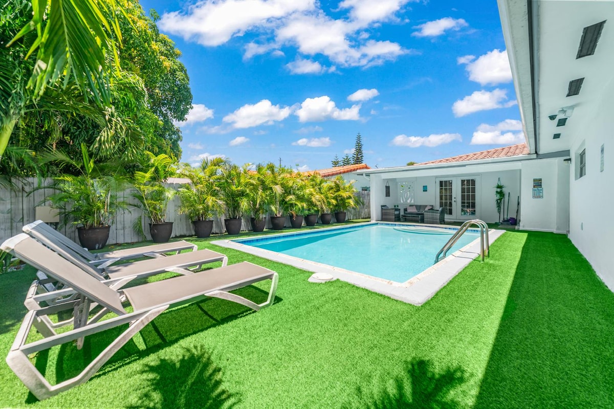 Renovated family home with 5 bedrooms and 4 full bathrooms. Heated pool year-round, mini golf, BBQ area and swing. Modern design with piano and Smart TVs. Parking for 5 cars. Prime location near airport, beaches and nightlife. Sleeps up to 16: 1 king, 2 queen, 2 full, 2 twin and 2 sofa beds (full & queen). Please confirm total guests. Add pets to reservation. Notify us if traveling with children for pool fence.