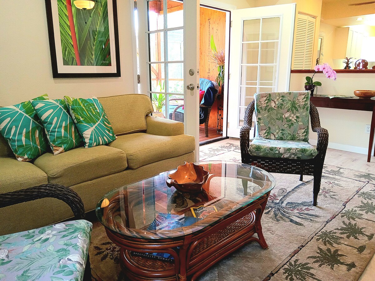 A beautiful , spacious, top floor apartment with a high slanted ceiling, comfortable sitting area, 48” flat screen HD Oled tv, coffee table, EZ chair and couch. The cozy bedroom has a Queen sized bed with an ocean view! The bathroom has a vanity, mirror, and a shower/bath combo. The Lanai has a great view of the Pacific ocean. The kitchen has a medium sized fridge, microwave, toaster oven, coffee maker, hot plate as well as coffee cups, glasses, utensils, dishes and plates.