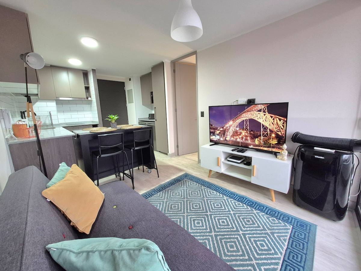 Modern apartment with a beautiful view of the mountain range 🤍 Located in a central and quiet sector, one block from the Conchalí subway, 15 minutes from the airport, 10 minutes from downtown Santiago and less than 5 minutes walk from the Chile Racecourse and Santa Laura Stadium. 1 bedroom + sofa bed in living room Equiped kitchen Private bath Balcony overlooking the mountain range WiFi and TV with Apps Fully Equipped Modern, comfortable and minimalist Swimming pool, gym, quincho, co-work and event room