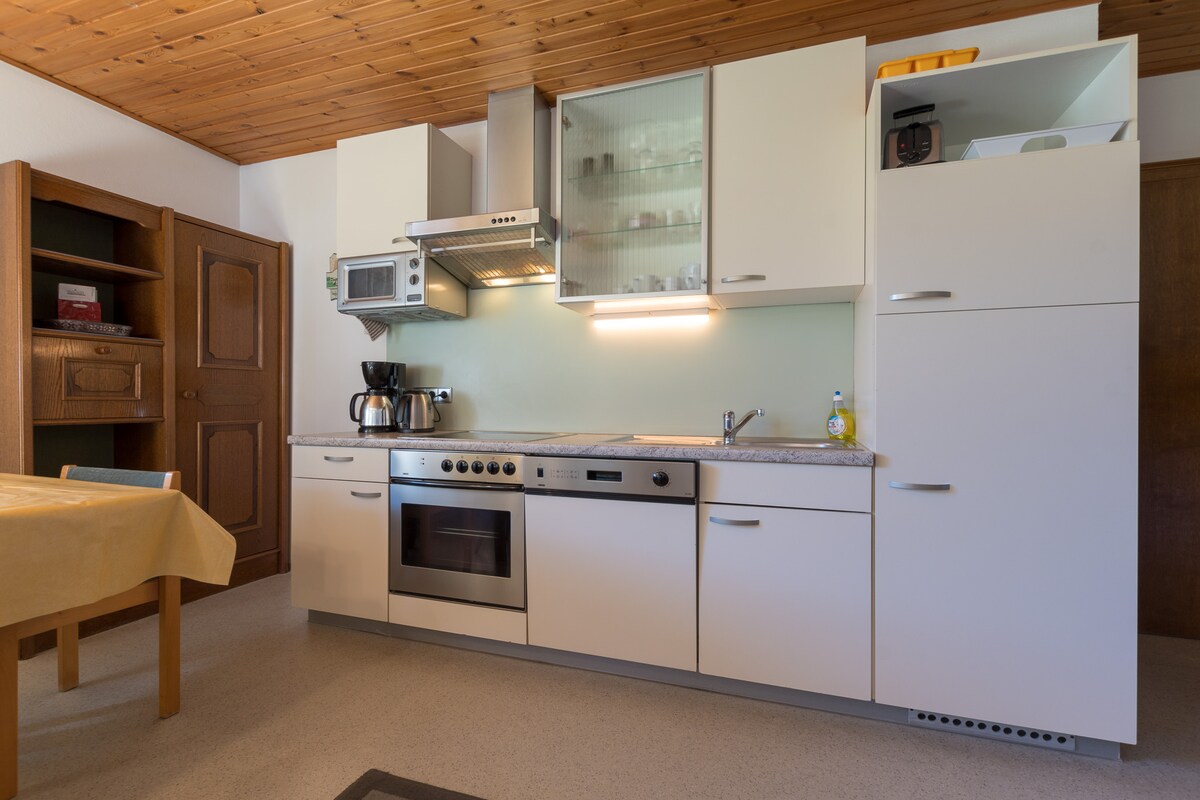 The apartment is quiet and centrally located, has a balcony and its own fireplace. The fully equipped kitchen invites you to cook comfortably and the central location allows you to easily reach the local restaurants, cafés and supermarkets. You also have quick and easy access to the surrounding ski or hiking areas. You can use the in-house ski room to store your skis and ski boots. The car can be parked directly on the property.