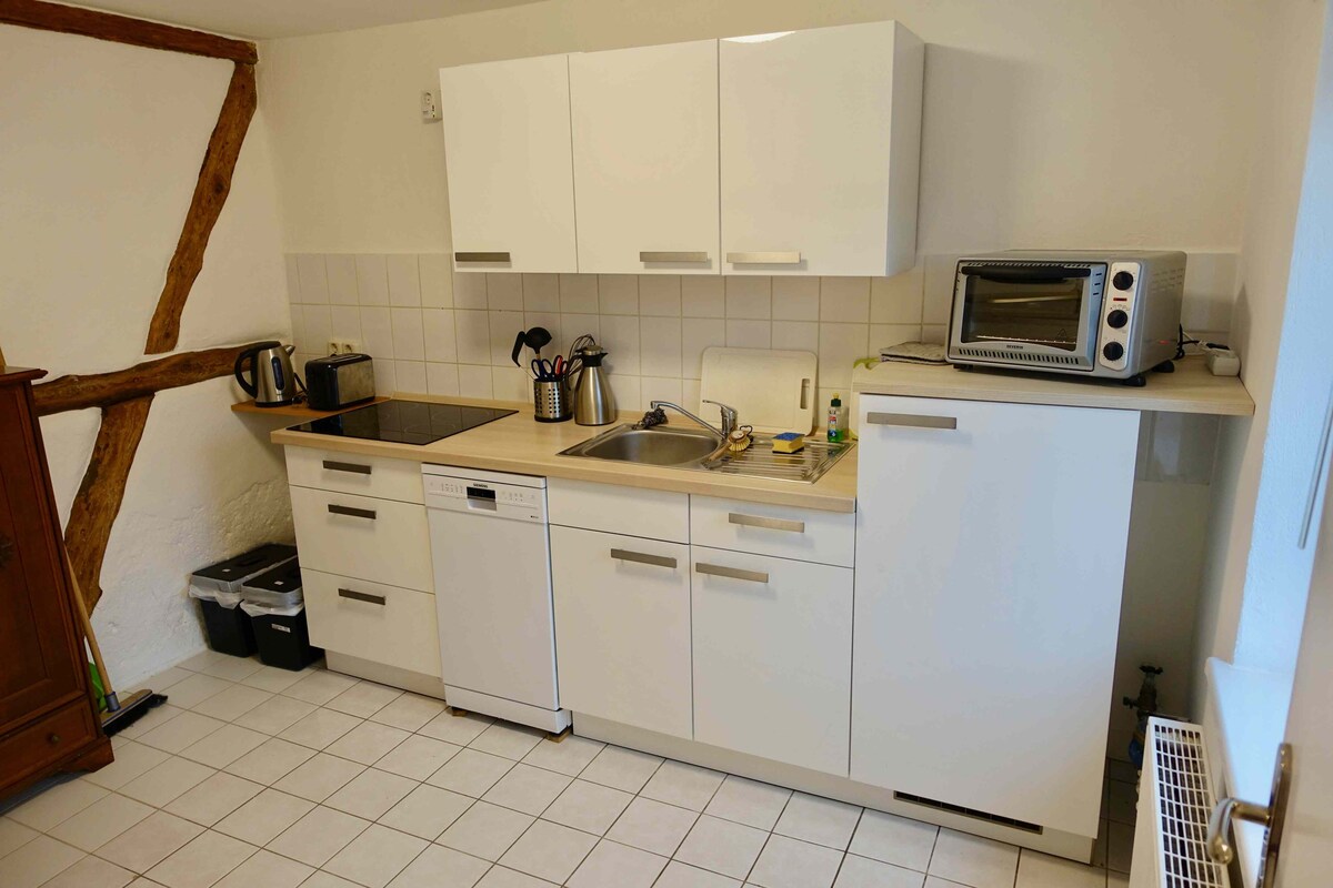 The sunny, light-flooded apartment "Scheunendiele" is located in a converted half-timbered barn with its own garden and sun terrace. Spacious 60 square meters, living room with open, fully equipped kitchen, offer space for 2-4 people. The dining area equipped for up to 4 people is next to the living area with a couch and armchairs and an additional reading corner by the fireplace. The two bedrooms are located on the upper floor, overlooking the beautiful garden.