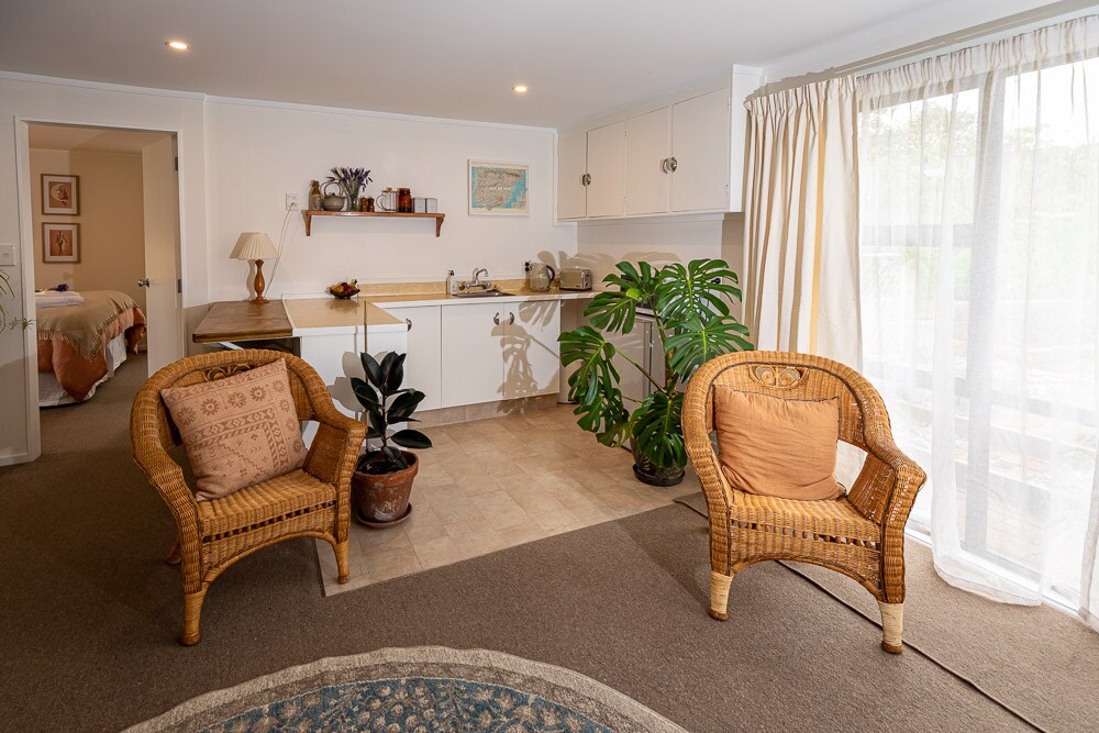 Seven minutes walk from Otaki Beach. Relax and unwind on your own private deck off our newly built sunny garden guest suite. Our self-contained suite is situated away from the main house and is ideal for a couple, solo adventurers, and business travelers. We provide a comfy bed and optional cooked breakfast. As well as full cooking facilities. Time it right and you can help yourself to seasonal produce from the garden and free range eggs from our lovely chooks.