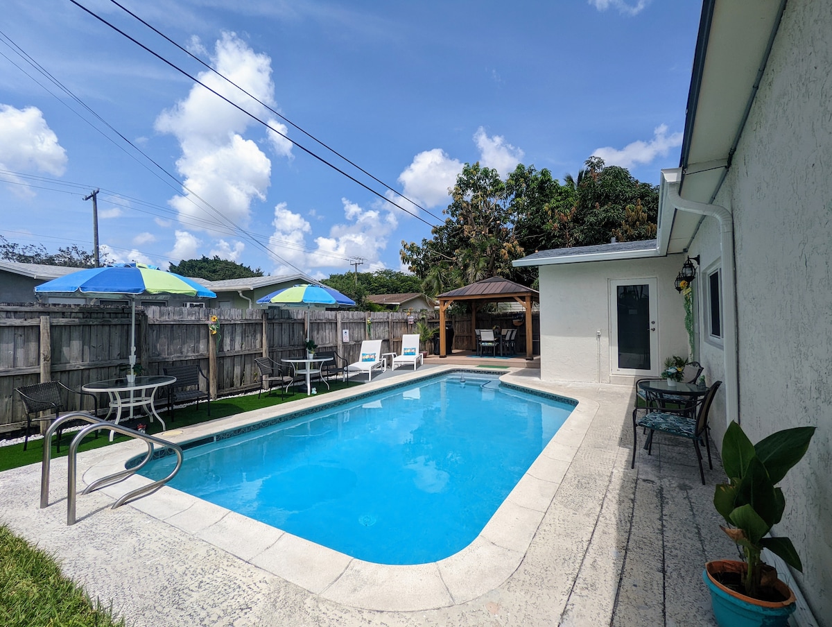 "This house was everything it seems and more!" - June, 2024, Brittany. Discover a stunning villa renovated in 2022! It features 4 spacious bedrooms, 2 stylish baths, and a bright open living area with a modern kitchen. Enjoy the outdoor dining area and gazebo for relaxing days. We can't wait to host you! ☆ Completely Renovated in 2022 ☆ Heated Pool and Gazebo ☆ Hollywood and Hallandale Beach - 15 minutes ☆ Spacious outdoor dining space with lights and fan We always available to assist!