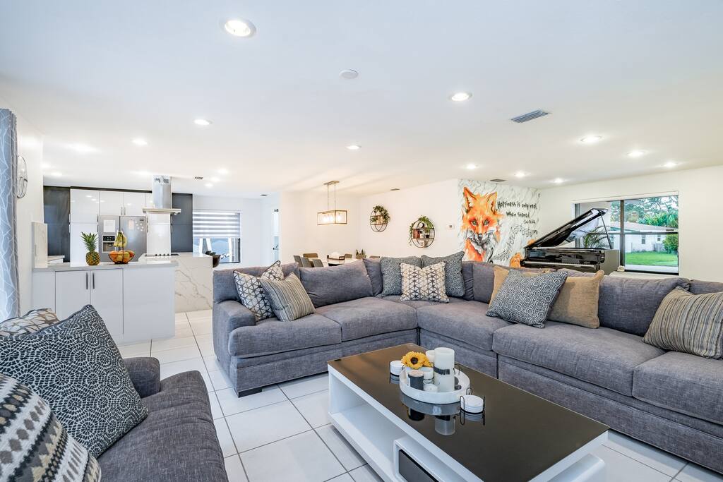 Stunning Villa in a quiet neighborhood surrounded by palm trees, featuring an open concept living space, 3 bedrooms, 2 bathrooms , fully equipped chef’s kitchen with top of the line appliances, indoor and outdoor covered dining and hang out area, office space, heated -pool, outdoor jacuzzi, BBQ grill and more..10 minutes away from the ocean, 15 min away from FLL Airport, close to most exciting spots in FLL. Publix, Starbucks, CVS only 5 mins away. We look forward to welcoming you!