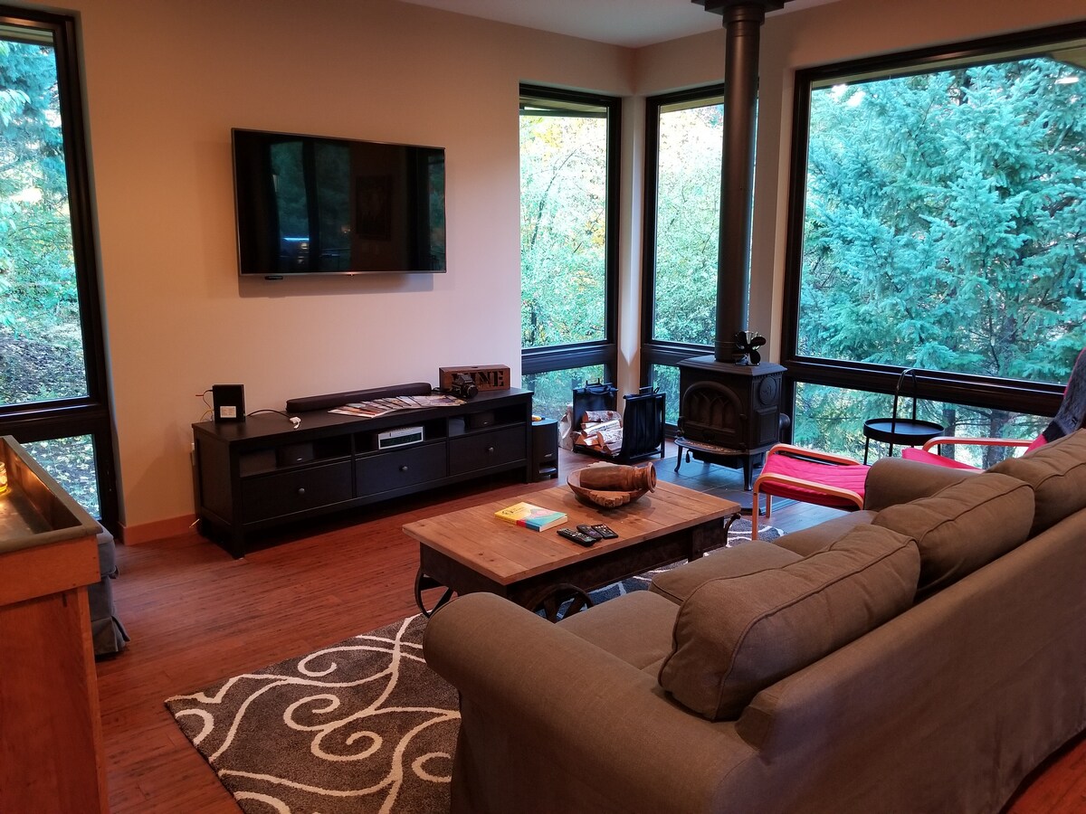 This upscale modern Mt. Hood cottage offers you the perfect spot to set up camp while visiting the area for winter or summer sporting activities. Relax in the cozy living room/great room which features vaulted ceiling with dimmer lights, a remote powered fireplace, Dining table, and 65' Smart TV. The large deck and backyard is tree filled and right on a creek! Clackamas county quite hours required between 10PM-7AM STR-Cert #1044-24-flat