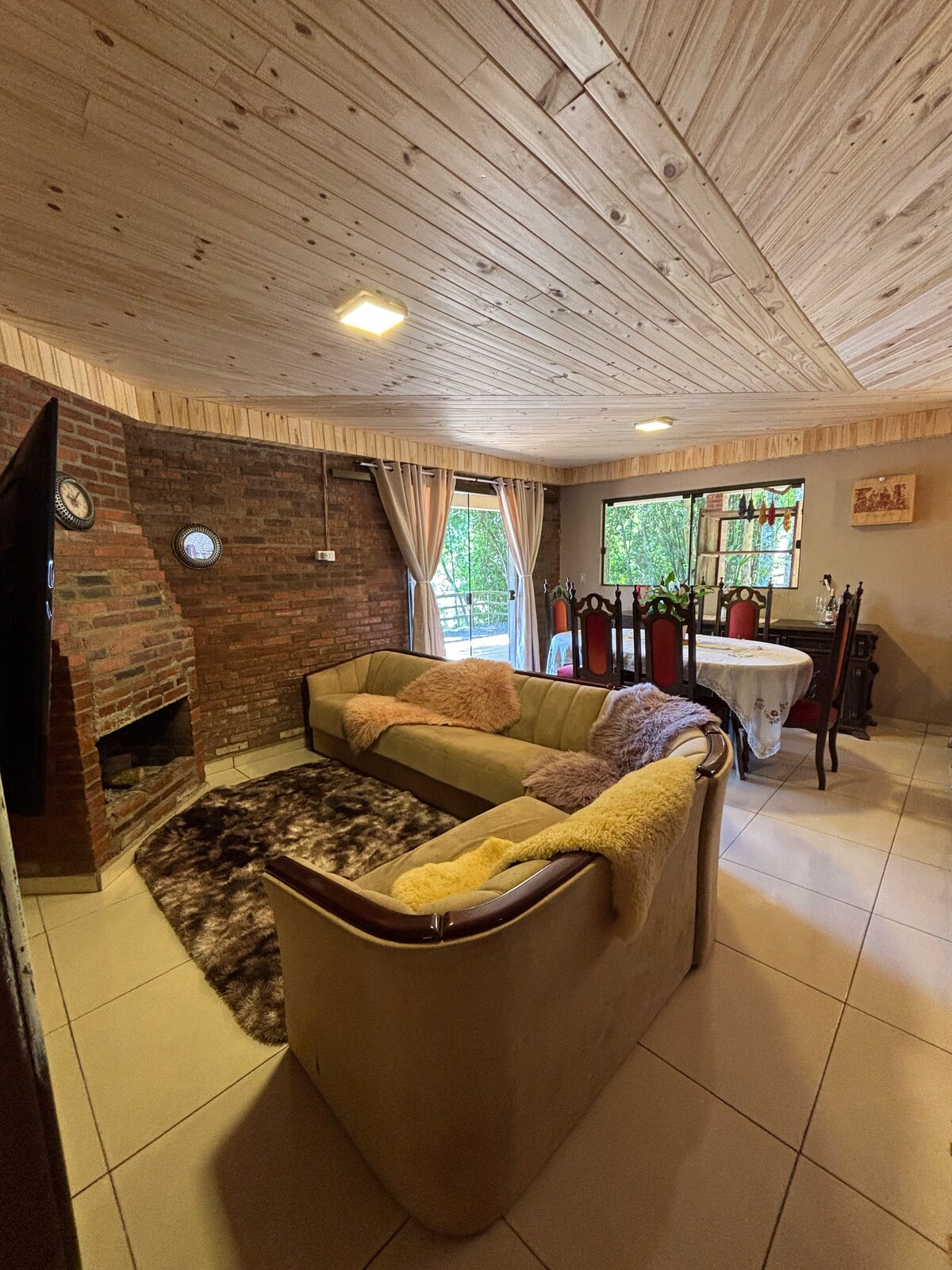 Relax in this peaceful place, surrounded by nature. Listen to the birds singing and the sound of the waters of the Lajeado Minas River. The cabin is surrounded by native vegetation, with access to the river and has hiking trails. The cabin's kitchen is complete with utensils, an electric oven, microwave and minibar. The living room has a sofa bed, whirlpool bathtub and TV with access to Netflix. There is an outdoor deck overlooking the vegetation and sunrise. Outside, there is a wood-burning fireplace and a kiosk with a barbecue grill.