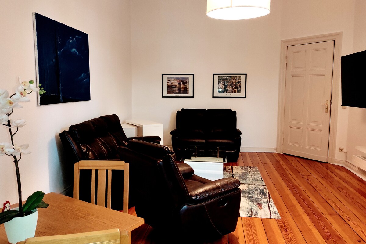 Equipped with a complete kitchen, comfortable bed (queen) and convertible sleeping sofa (double), a spacious bath and terrace, the studio invites you to spend lovely days in central Cottbus. It is ideal for two persons or a couple with baby or toddler . We have special provisions for kids on request such as cot or high chair.