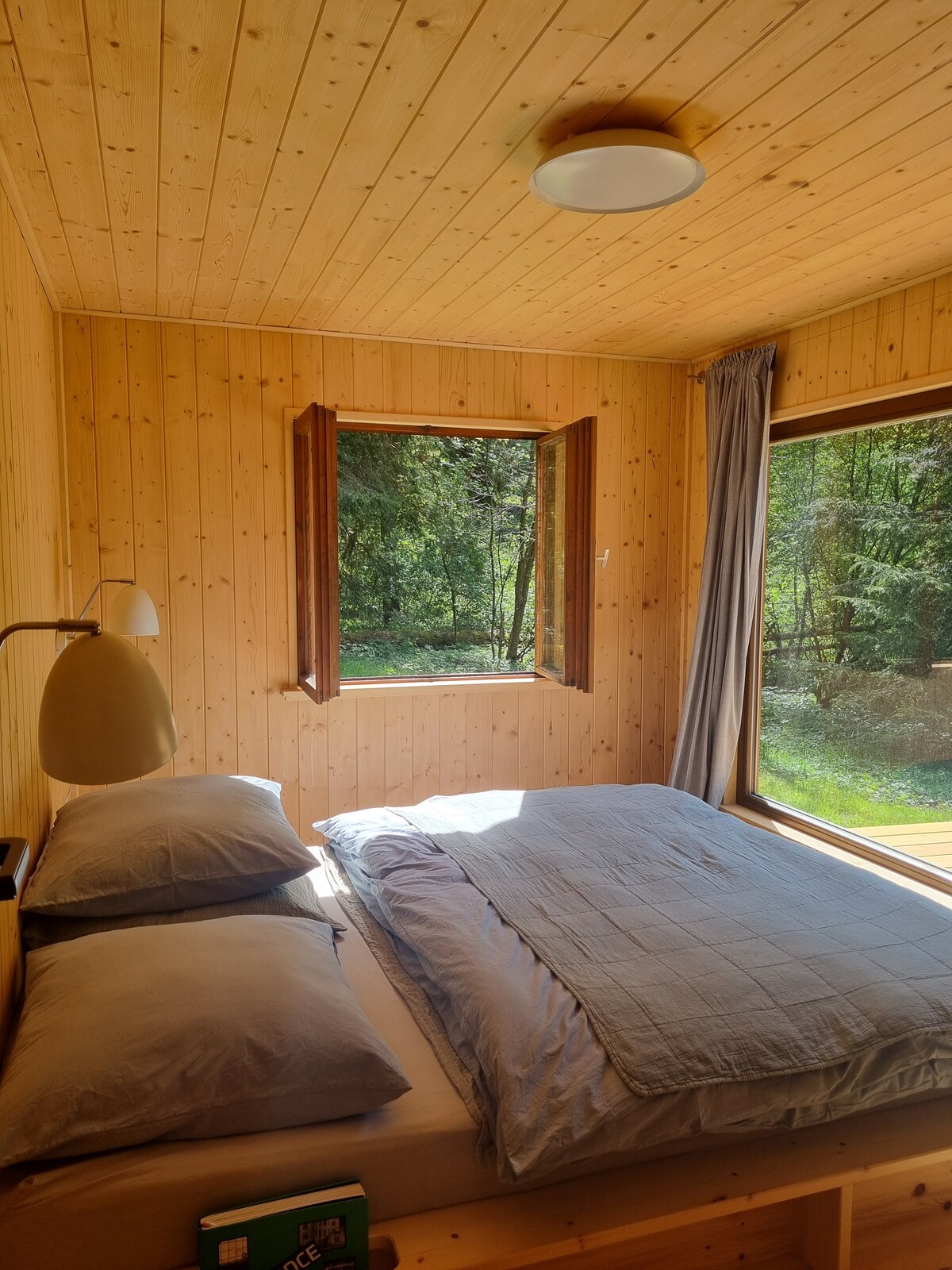 Moss Dreams is a wood cabin that sits in a garden surrounded by pine, apple, and birch trees, with soft moss underfoot. Sleep under the stars, surrounded by trees, and wake up to birdsong, goats, sheep, and cowbells; enjoy meals under a gazebo and sunsets around the campfire. Cozy but simple, Moss Dreams is a place to reconnect with nature, loved ones, and yourself. It is sensitively designed to help you enjoy your stay and unwind.