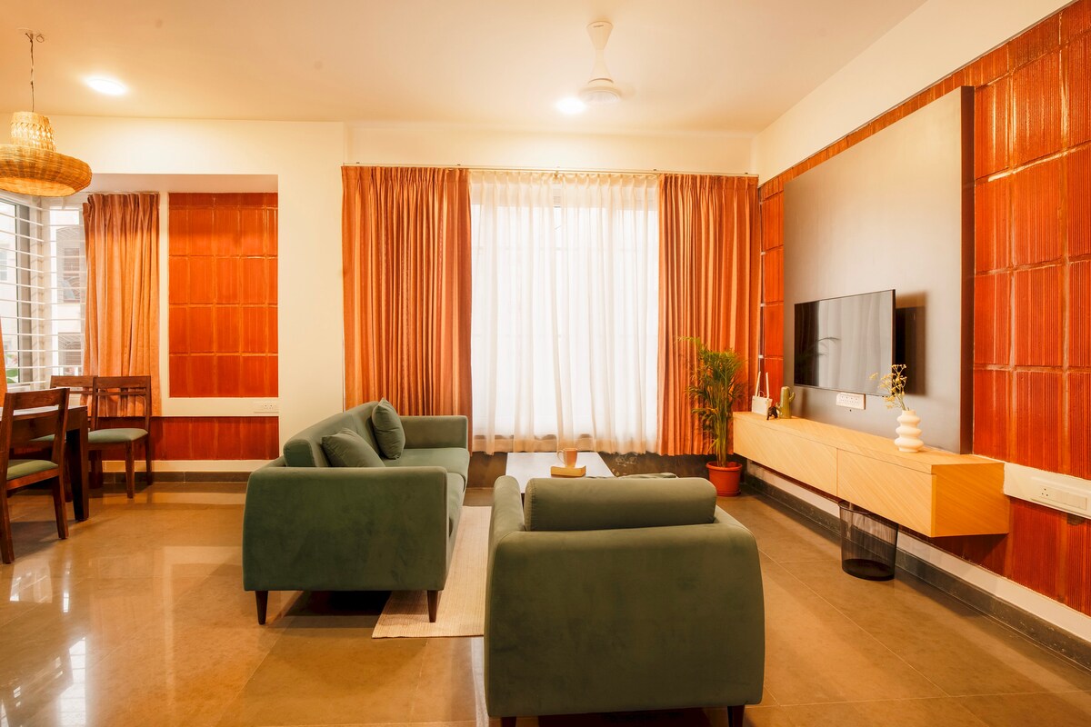 We would love to host you in our 1 BHK (EARTHY Homestay) that blends style with an earthy, peaceful vibe & unbeatable panoramas. - Balcony Oasis: Forest view + cinematic sunsets at 200 m - Prime Locale: 2 min to NIFT & 3 min to 27th Main’s cafés, boutiques & street‑food - Serene Interiors: Queen bed, ambient lighting & lush live plants - Work & Play: High‑speed Wi‑Fi, Large TV and fresh air Experience style, serenity & spectacular sunsets—all in one cozy retreat! - 5th floor (No Lift)