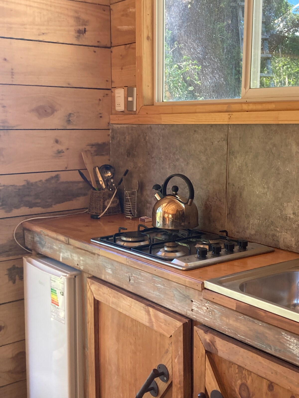 Rustic Self catering Cabin with 2 bedrooms, sleeps 4 Adults. With full kitchen including 2 plate Gas stove, electric oven, fridge and cooking utensils. Bathroom with Hot water shower. Opens up onto a Private balcony with great views of Patagonia. Bed linens, towels provided. With parking. Perfect place to rest with family or friends whilst travelling through Chilean Patagonia. Please be aware Cabin is reached by walking through country side terrain.