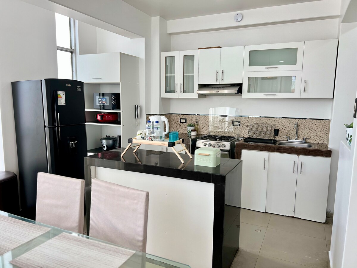 Enjoy the tranquility and exclusivity of this mini-apartment with a separate entrance, very well furnished, on the second floor of the building. It is located just 3 blocks from Plaza Mayor, the best area of Nuevo Chimbote. Two blocks from Avenida Argentina, where you can enjoy different types of food in exclusive restaurants, among other details. By car it is 4 minutes from the UTP and the Real Plaza de Nuevo Chimbote. Close to El Dorado (10 min) and Vesique (20 min) beaches