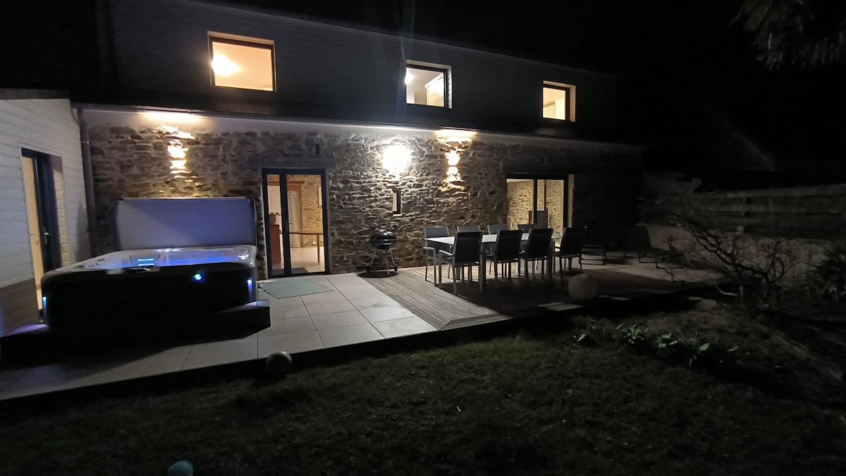 Cottage ideally located to discover Finistère. About 20 minutes from Brest, Quimper, Crozon Peninsula, Carhaix and the beautiful Breton Islands. Gîte (for 6 people (3 double beds) + 1 baby bed + 1 trundle bed for 2 people), completely renovated, 120 m² includes: a large 60 m² living room (kitchen-living room), sauna, overlooking a garden (1500 m²) beautifully flowered and furnished with a terrace (60 m²), spa, barbecue, garden furniture, deckchairs. Quiet assured. Private road, no traffic.