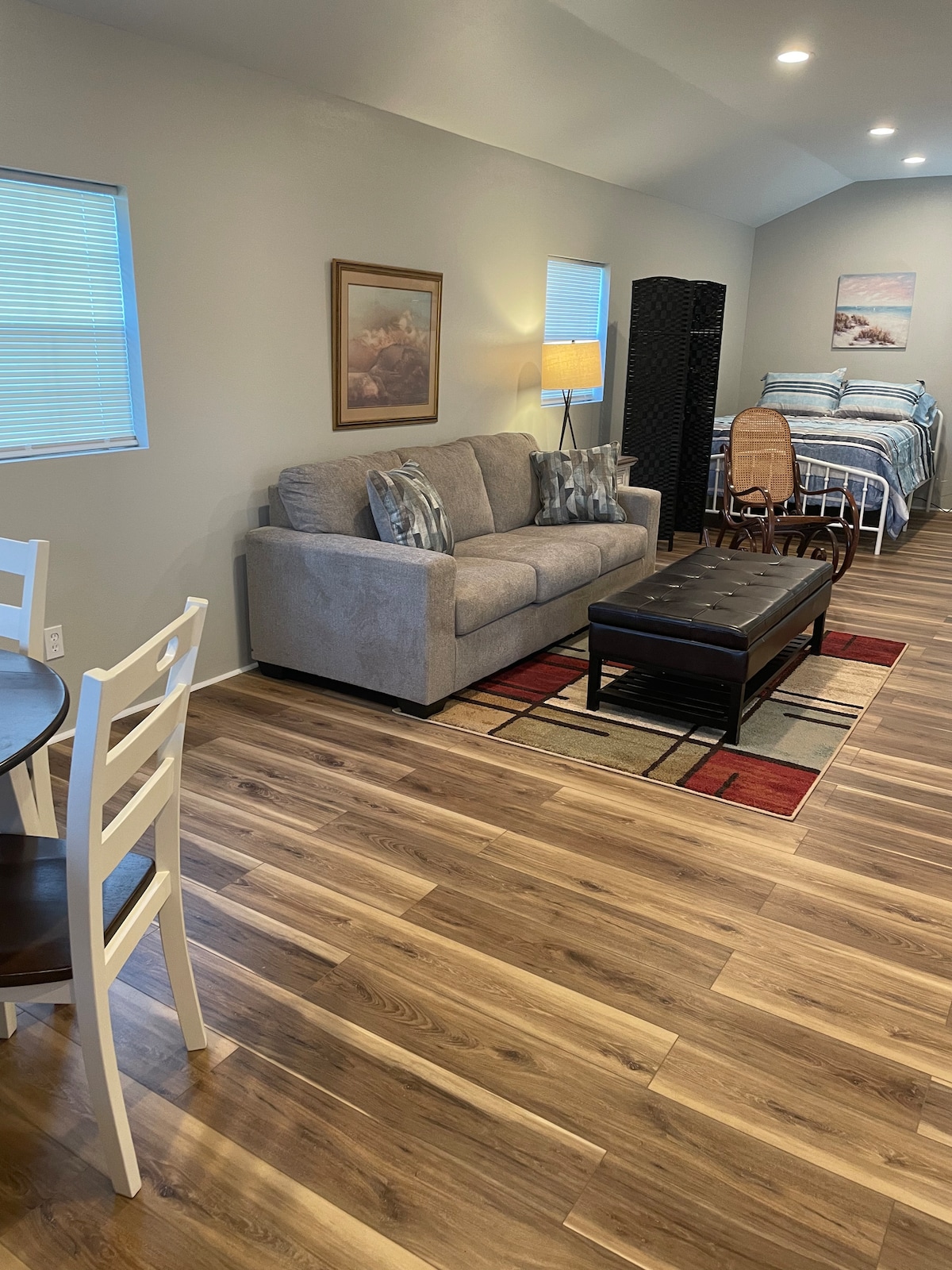 This is a 552sqft apartment within our home. It has a completely private driveway and entrance and secure locking interior door between units. One of the features we think you'll most enjoy is the spacious shower with all the hot water you could want! The kitchenette is ready for a bit of cooking if you like. In addition to the King bed, the sofa folds into a bed suitable for an older child or young adult, and a twin mattress on the floor is available upon request.