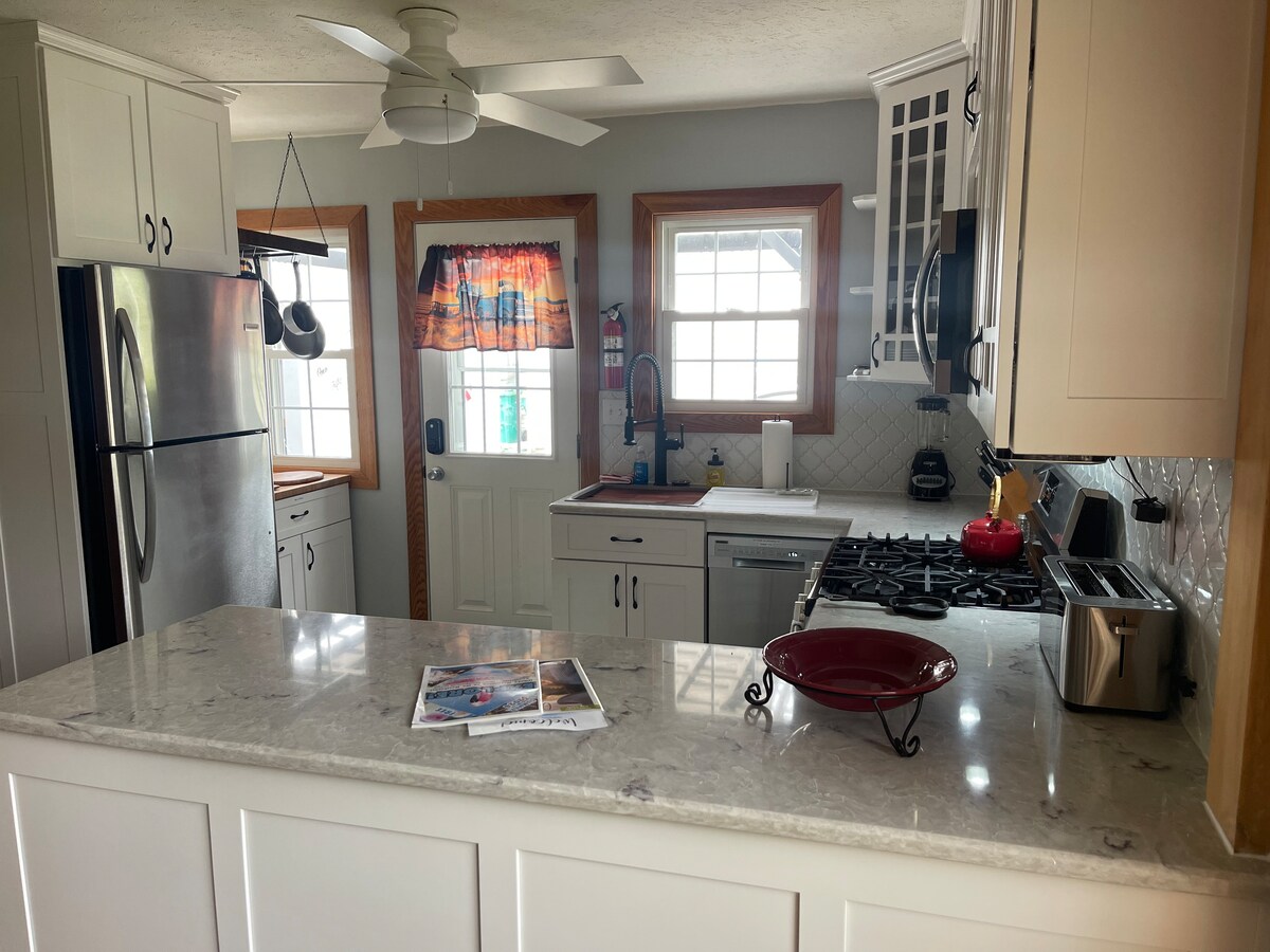 Fully remodeled in 2024, LemonDrop Cottage is a Lake-Front property, with direct access by stairwell down to a small private beach directly on Lake Erie. Lake is viewable from the Kitchen or Bedroom windows. All New Windows, Hickory hardwood floors, shower, electric flat-top oven, retro-Fridge, retro-Microwave/Toaster, Keurig, King-size mattress, Twin sofa-bed, BBQ grill (propane provided), and fire pit with wood provided. Cottage built in 1949 as a fishing cottage, adorable Lake-Front Cabin wit