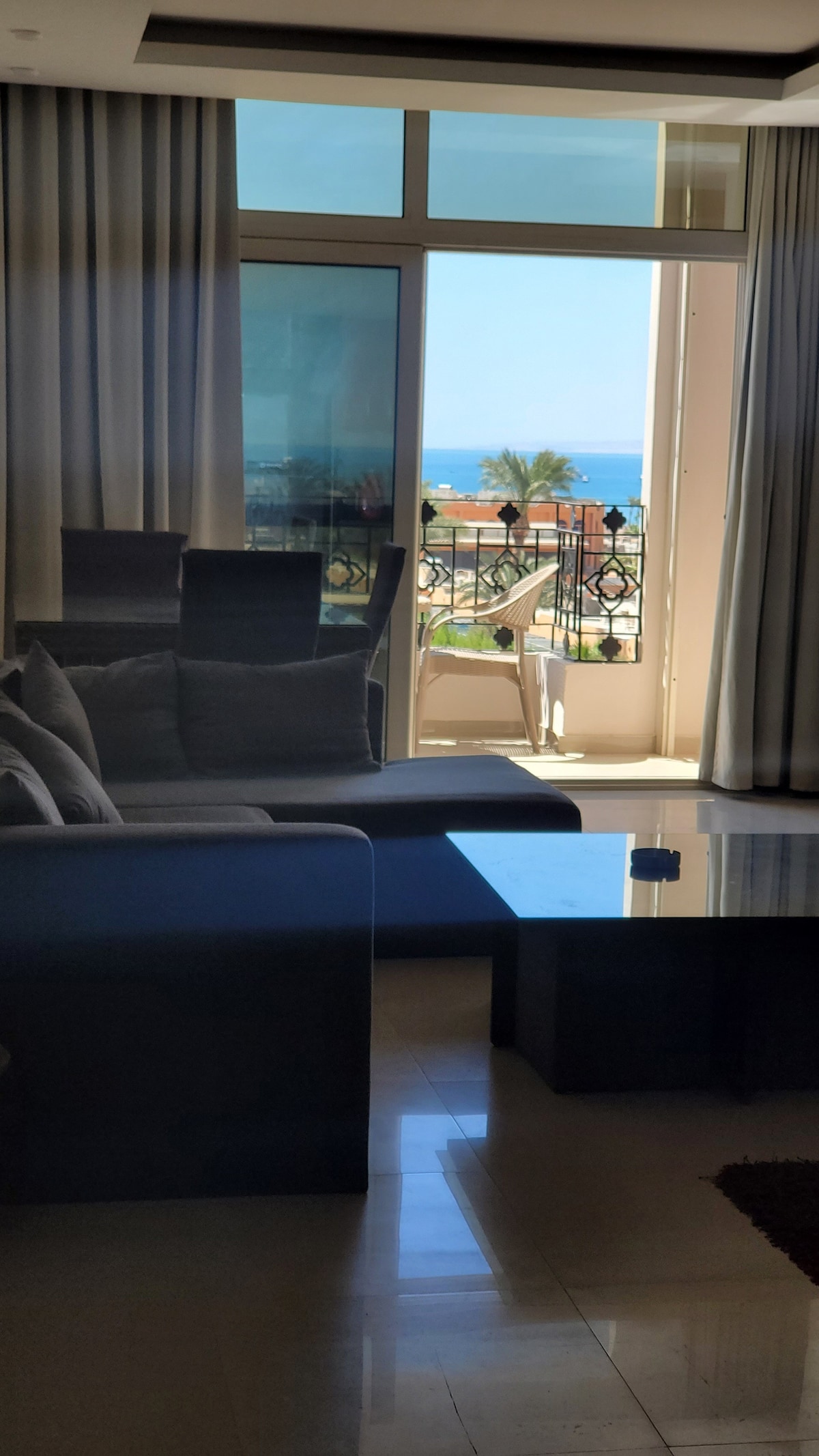 Luxury apartment with sea view in privacy compound in city center, with one bedroom has a king bed with balcony, full equipped kitchen, small living room with a big couch. The apartment is suitable for 3 adults or 2 adults with 2 kids, nice beach with amazing snorkeling area, 3 swimming pools, safety and has security's team, 500 meters from Marina yachts.