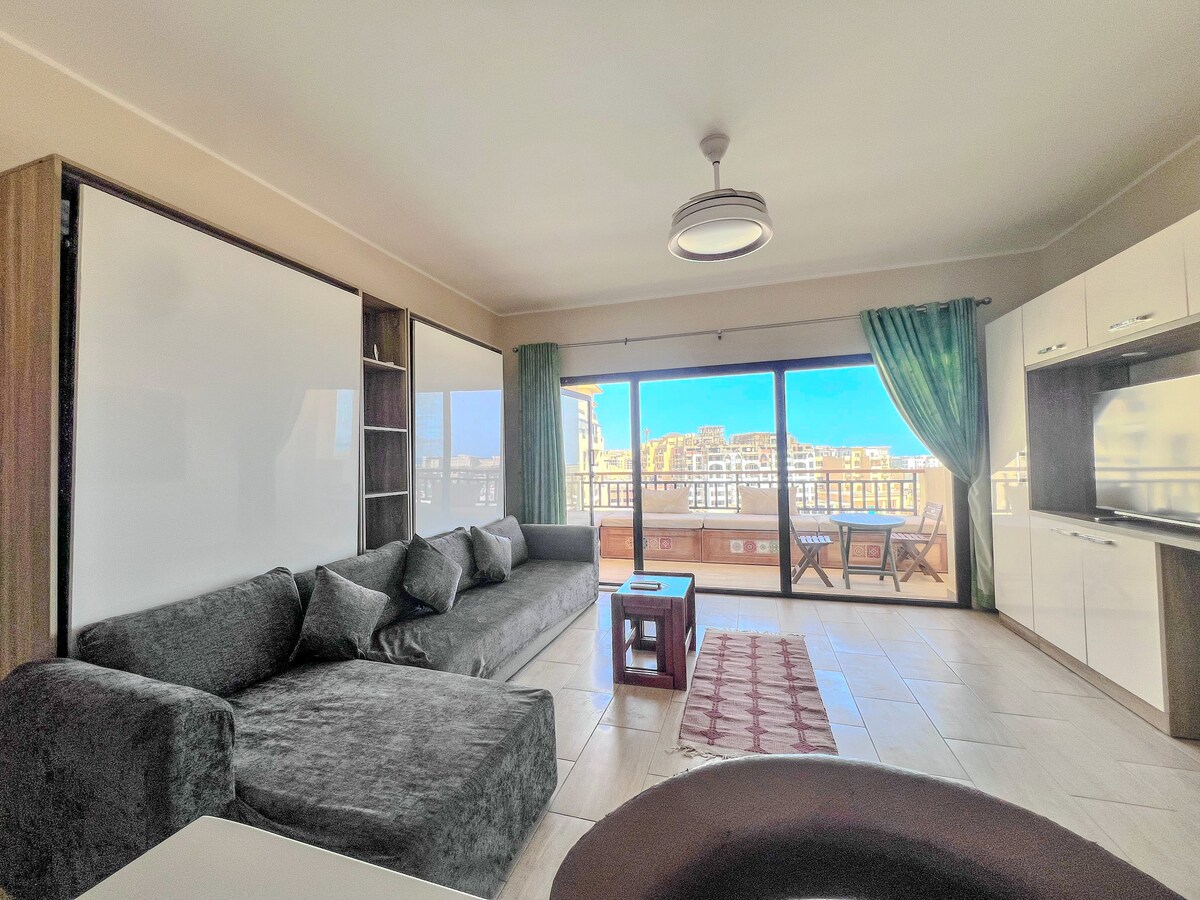 Imagine having everything you need in one place! Fully equipped apartment located in the heart of Hurghada, close to Downtown so no need for transportation everything you need is just steps away. The apartment located opposite the Marina, in front of the second gate. Enjoy a beautiful direct view of the Red Sea and the Marina, one of the most iconic and lively spots in Hurghada. Close to best beaches, restaurants, cafés, bars gyms, supermarkets, pharmacies, Largest mosque in Hurghada.