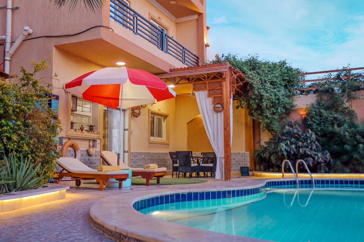 Amazing and Unique in Hurghada, family friendly holiday home or a romantic get away for honeymooners with a large private swimming pool only for you,nothing is shared Spacious livingroom, with open kitchen and toy corner Up, Master bedroom ensuite with shower and a bedroom with kingbed, bunkbed and a Playstation5 Bathroom to fully relax with a big Jacuzzi The villa is fully eqiuped with all what you need We will be honored to welcome you and make your stay amazing and arrange trips for you