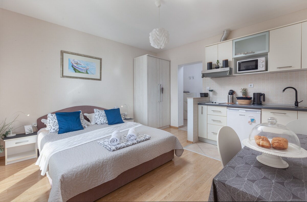 Nestled in the very center of Makarska, our studio apartments Roza (2+1) offer a peaceful escape surrounded by tall pine trees and the soft fragrance of a Mediterranean garden. Just steps from the main pebble beach, it’s a place where comfort meets nature.