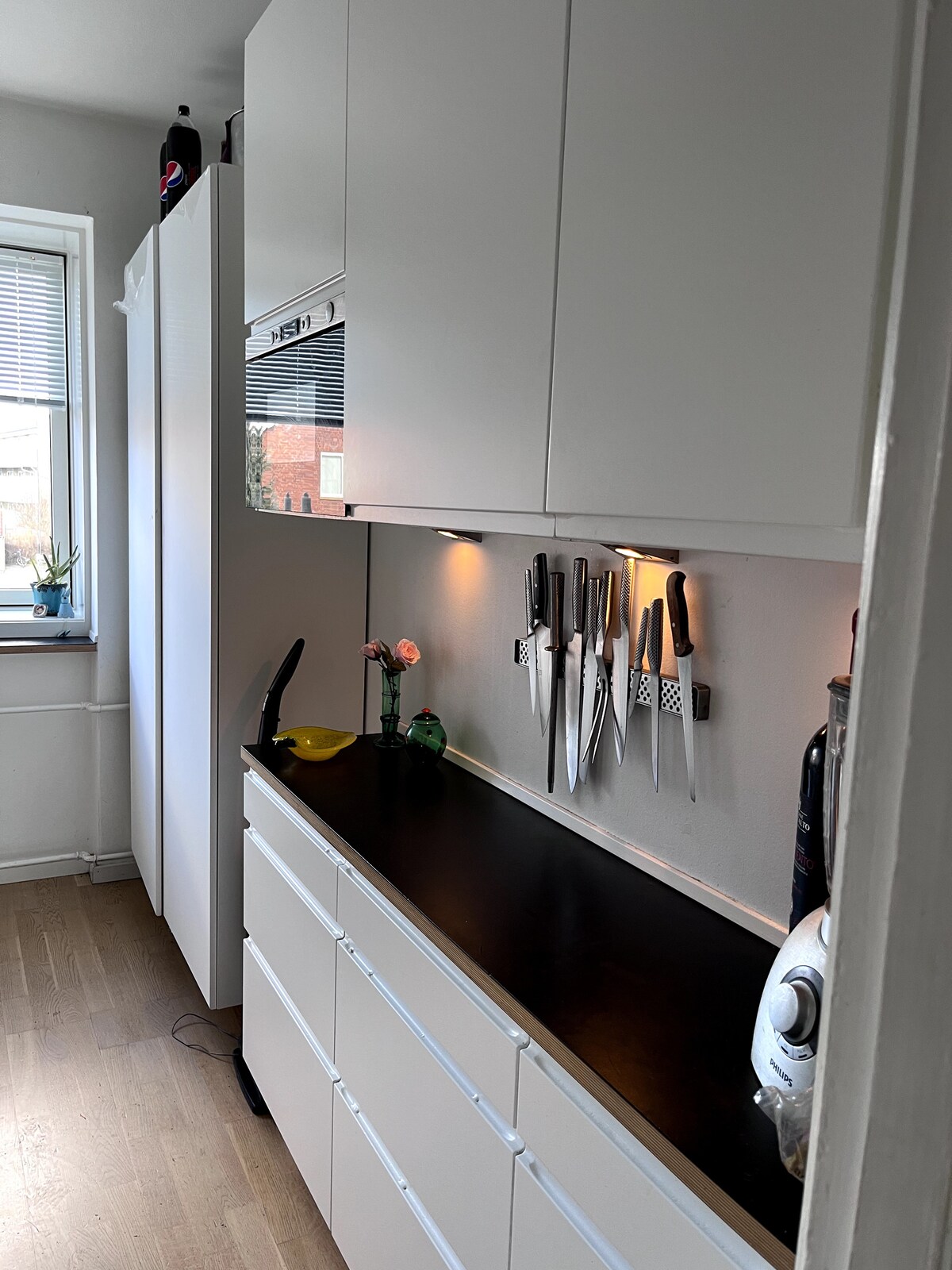 Welcome to our home, where spaciousness meets cleanliness and brightness. This modern haven offers a stunning view over the cityscape, inviting you to unwind and immerse yourself in newly built urban charm - Grønttorvet. From March to October you can experience the long nordic summer sunset from our living/dinning room. With an open kitchen layout, this space is perfect for socializing for a couple, friends or a small family.