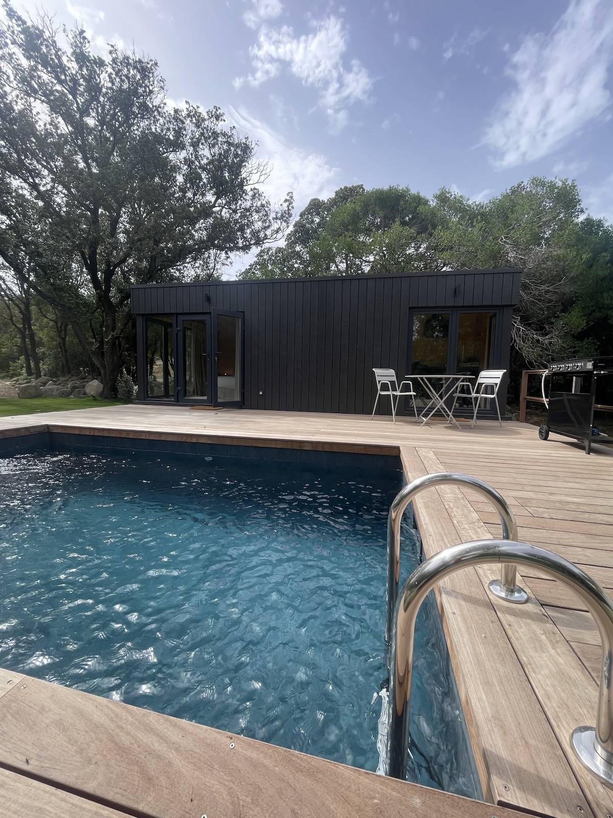 For nature lovers. The chalet, for 4 people (possible addition of 1 single bed for a child), will welcome you in the calm of my Bonifacian garden, in the middle of the olive trees. Bright living room and kitchen, bathroom, a large mezzanine bedroom, with two double beds. Dry toilet outside. Shaded terrace and parking, barbecue. The first beaches are 5 minutes away, the port is 7 minutes away. Energy self-sufficient property: photovoltaic power plant and solar water heater
