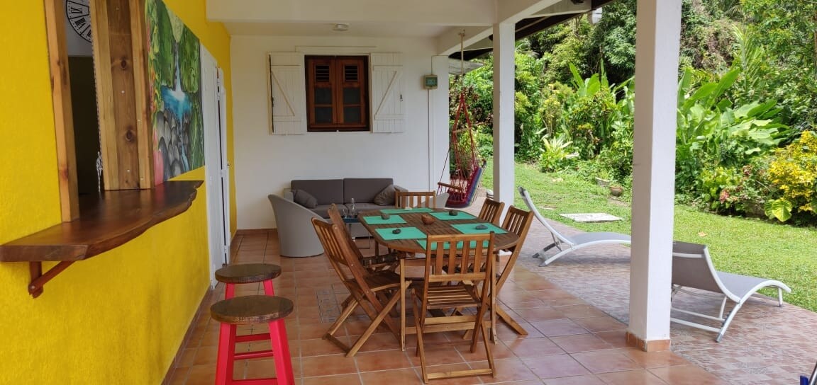 This spacious and pleasant accommodation has a large terrace to enjoy the garden and the view between the sea and the Monts-Caraibes. Perfect for a family on the go! The kitchen is well-equipped and the bedding is comfortable. All beds have good quality mosquito nets. Guests can enjoy our swimming pool, hot river baths (2 minutes' drive), Grande-Anse Beach (7 minutes). A nature stopover just 5 minutes' drive from the Saintes pier.