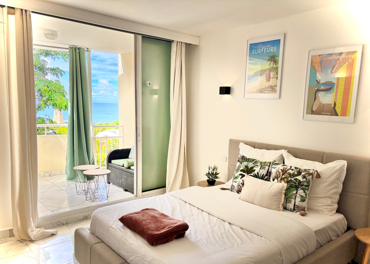 This studio, located in a residence, can accommodate 2 adults, 1 child under 16 years old and a baby. It is air-conditioned and offers a magnificent view of Tartane Bay as well as the island's landforms. A swimming pool is available within the residence. In addition, a beach is a 5-minute walk away. The studio is accessible via a corridor at street level, you can easily carry your luggage. Parking is available a few meters from the accommodation.