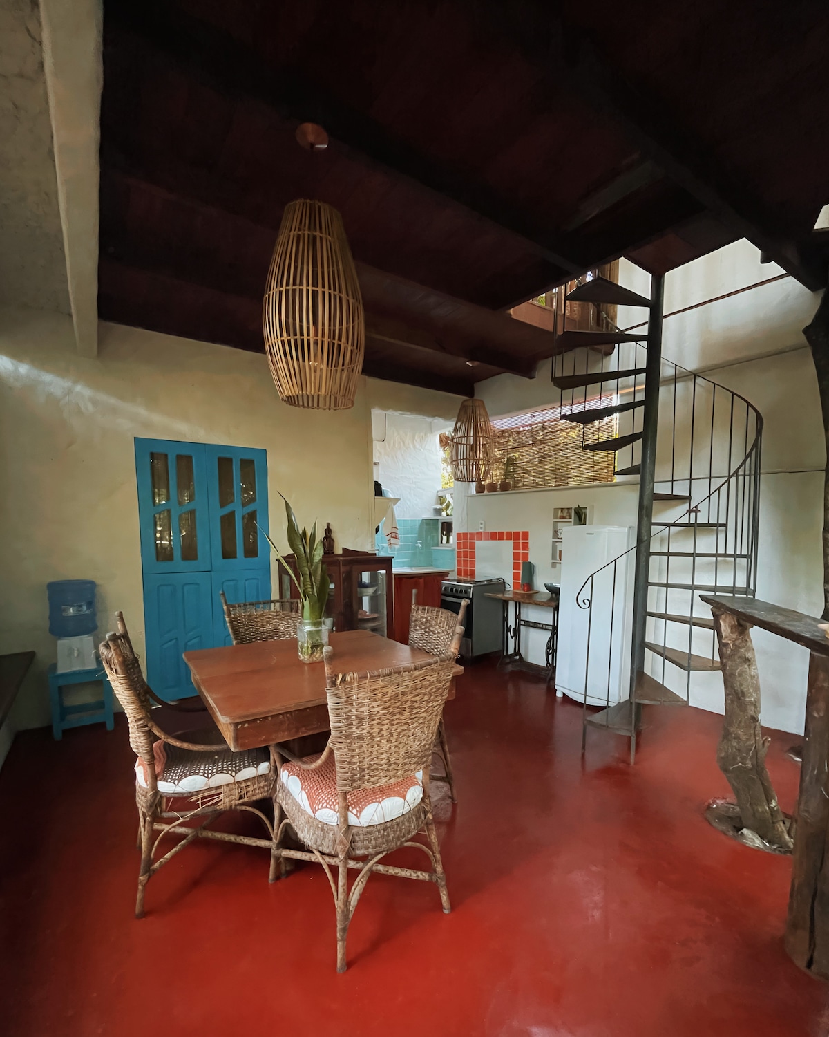 Apartment with balcony overlooking the sea. A large space that combines a bedroom with a living room, and a bathroom. Ideal for couples and small families. The bedroom has a double bed and can accommodate up to 2 more single beds. It has a sofa and a hammock to hang both inside and outside the house. The balcony, which is a continuation of the apartment, functions as another outdoor room. There is a hammock and table to sit at for breakfast or take a nap in the afternoon while enjoying the cool ocean breeze.