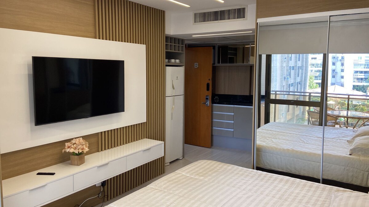 An excellent option for those seeking comfort and practicality for leisure or work. In front of Barra da Tijuca beach with a partial view of the sea, we have an infrastructure with swimming pools, fitness center, movie theater, beauty salon, free parking... Modern, the space offers a kitchen, air-conditioning, a double bed, and a balcony with an incredible view. Well located, in front of Barra beach at Posto 5, next to shops and restaurants and close to shopping malls, concert halls, tourist attractions...