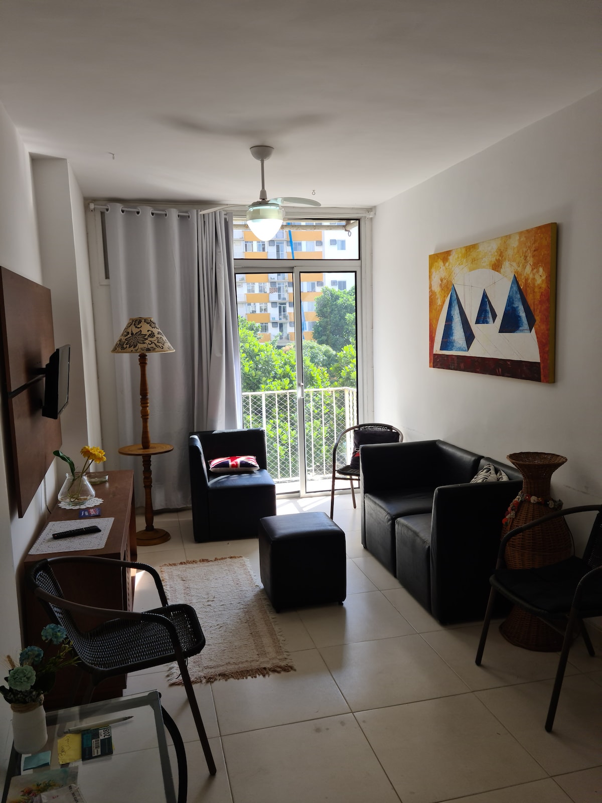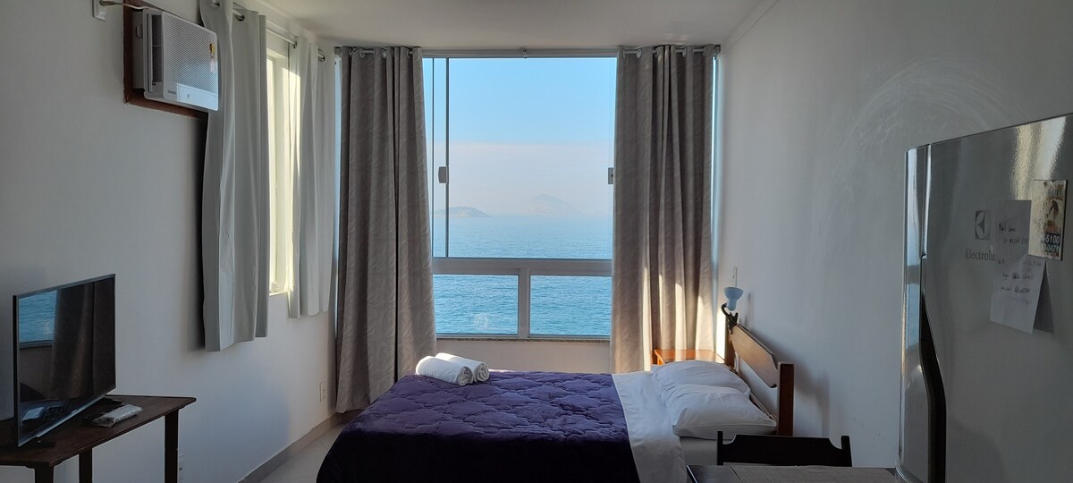 66 m² apartment, with a perfect view of the Barra da Tijuca sea. Morning sun. Large balcony; living room with ceiling fan and sofa bed; 01 bedroom with double bed, air-conditioning and ceiling fan; kitchen with stove, refrigerator and microwave; recently renovated bathroom and dining room in a prime location on Barra beach (post 5).